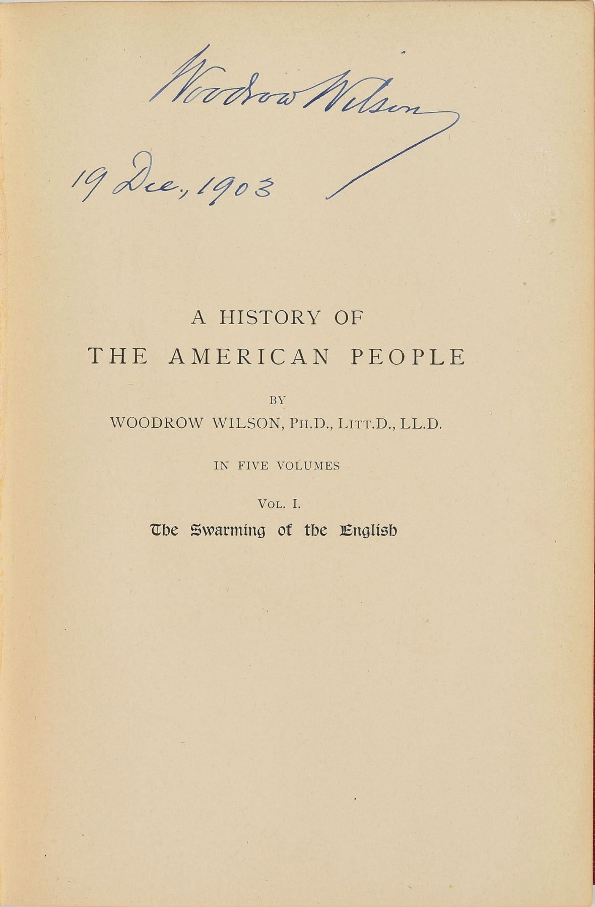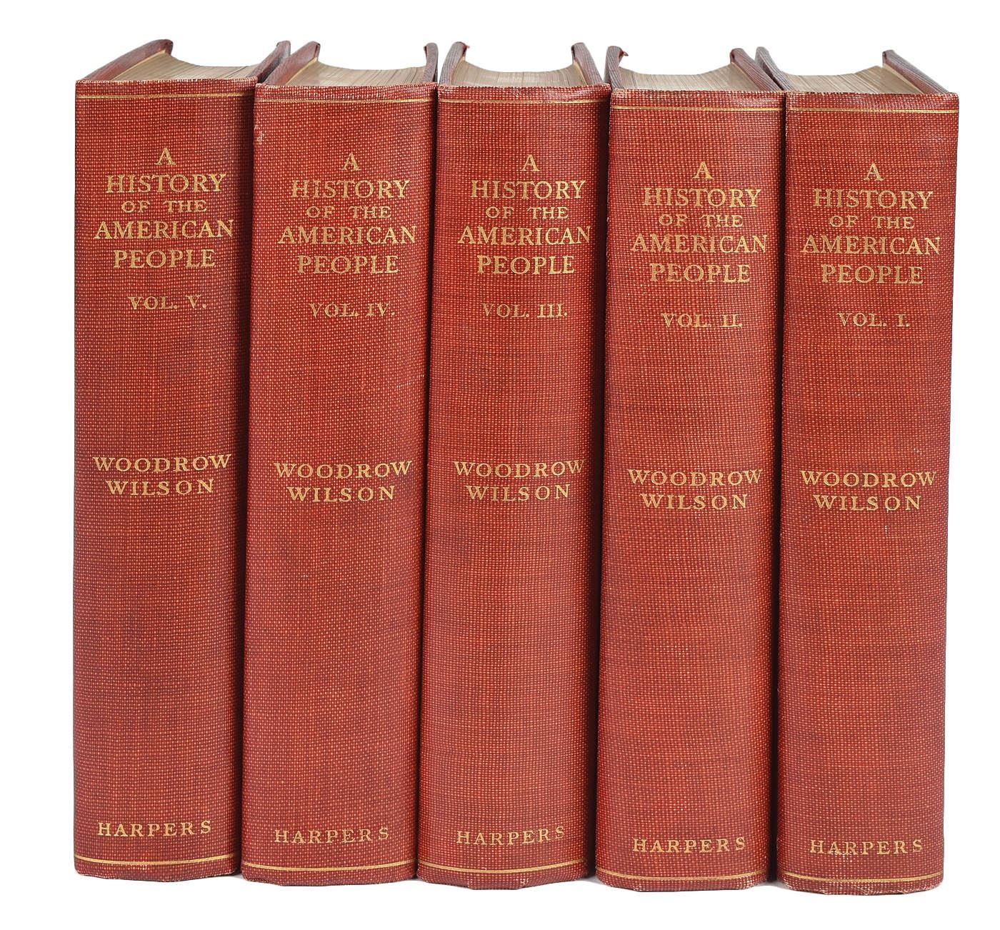 Complete book set: History of the American People, Volumes 1–5. NY: Harper & Brothers, 1902. Hardcovers, 6 x 8.75. Neatly signed on an opening page of the first volume in black ink, "Woodrow Wilson, 19 Dec., 1903." Autographic condition: fine. Book condition: VG/None, with minor marks and scuffing to boards, and mild sunning to spines. The culmination of a series of articles written for Harper's Magazine, this full five-volume set serves as an impressive example of a format seldom signed by Wilson.