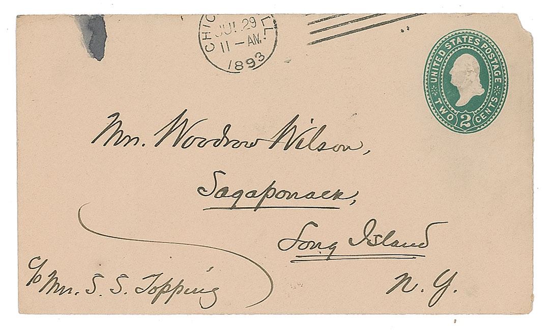 Hand-addressed envelope, 5.75 x 3.25, addressed by Wilson to his wife, “Mrs. Woodrow Wilson, Sagaponack, Long Island, N. Y., c/o Mrs. S. S. Topping.” Envelope is postmarked July 29, 1893. In fine condition, with a stray ink blot and trivial paper loss to one corner tip. Accompanied by a full letter of authenticity from PSA/DNA.