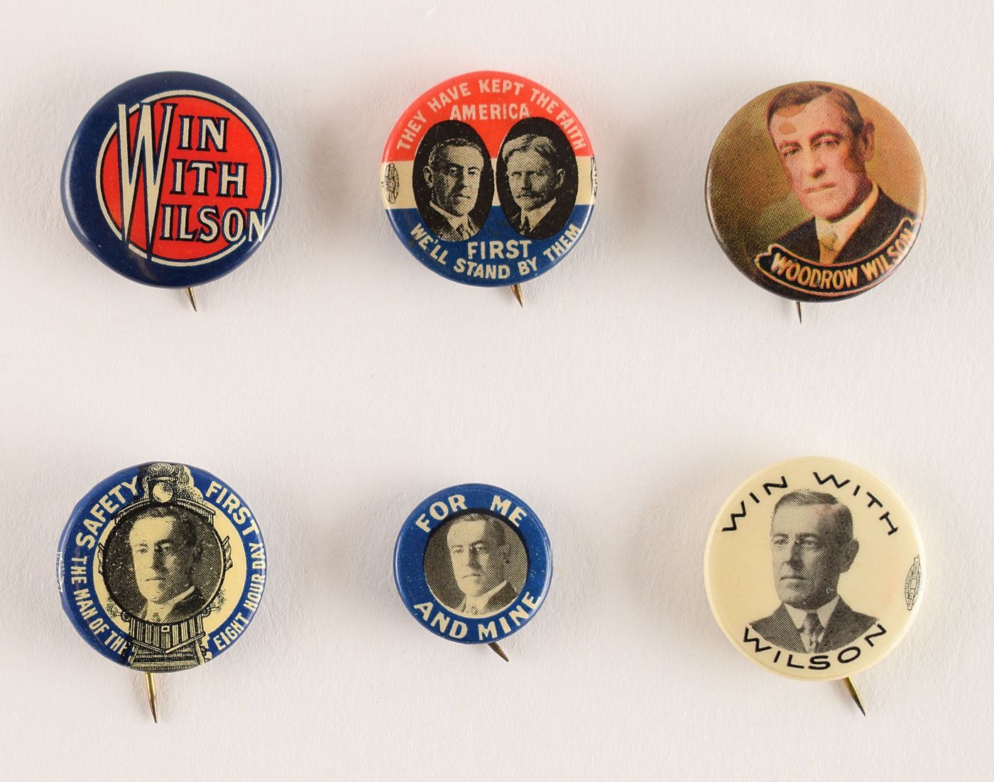 Six celluloid pinback buttons associated with Woodrow Wilson and his presidential campaigns, circa 1912–1918, measuring between 5/8? and 7/8?, including a jugate pin featuring President Wilson and Vice President Thomas R. Marshall, a "Win with Wilson" slogan pin, a color portrait pin, and three black-and-white portrait pins with different slogans ("Win with Wilson," "For Me and Mine," and "Safety First: The Man of the Eight Hour Day"). In overall fine condition.