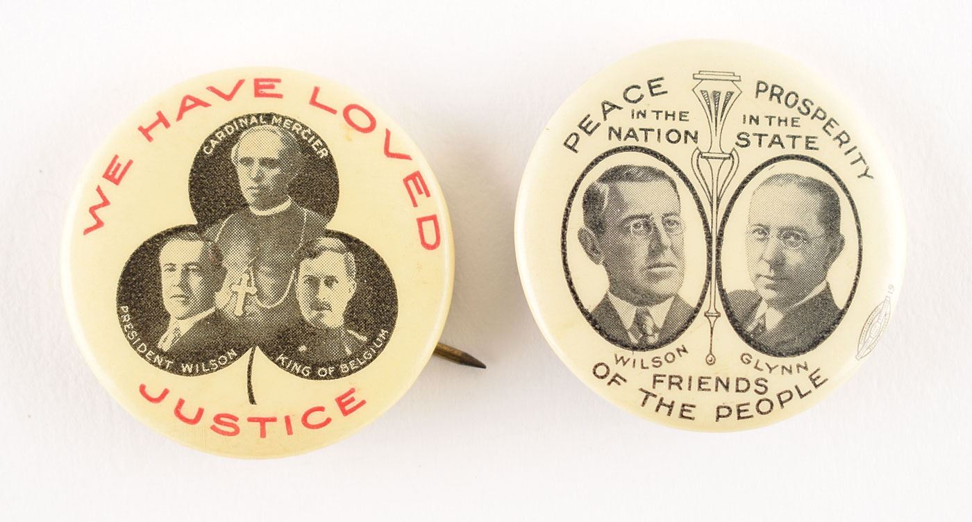 Two interesting Woodrow Wilson celluloid pins: a 1 1/4? jugate pin featuring Wilson with New York Governor Martin H. Glynn, with black text, "Peace in the Nation, Prosperity in the State, Friends of the People"; and a World War I–themed 1 1/4? trigate pin depicting President Wilson, Cardinal Mercier, and the King of Belgium with red text, "We Have Loved Justice," with a Bastian Bros. paper backer insert. In fine condition.