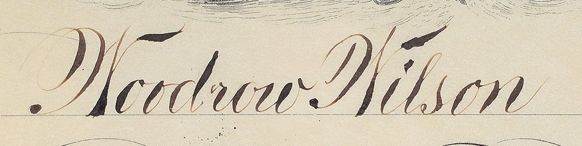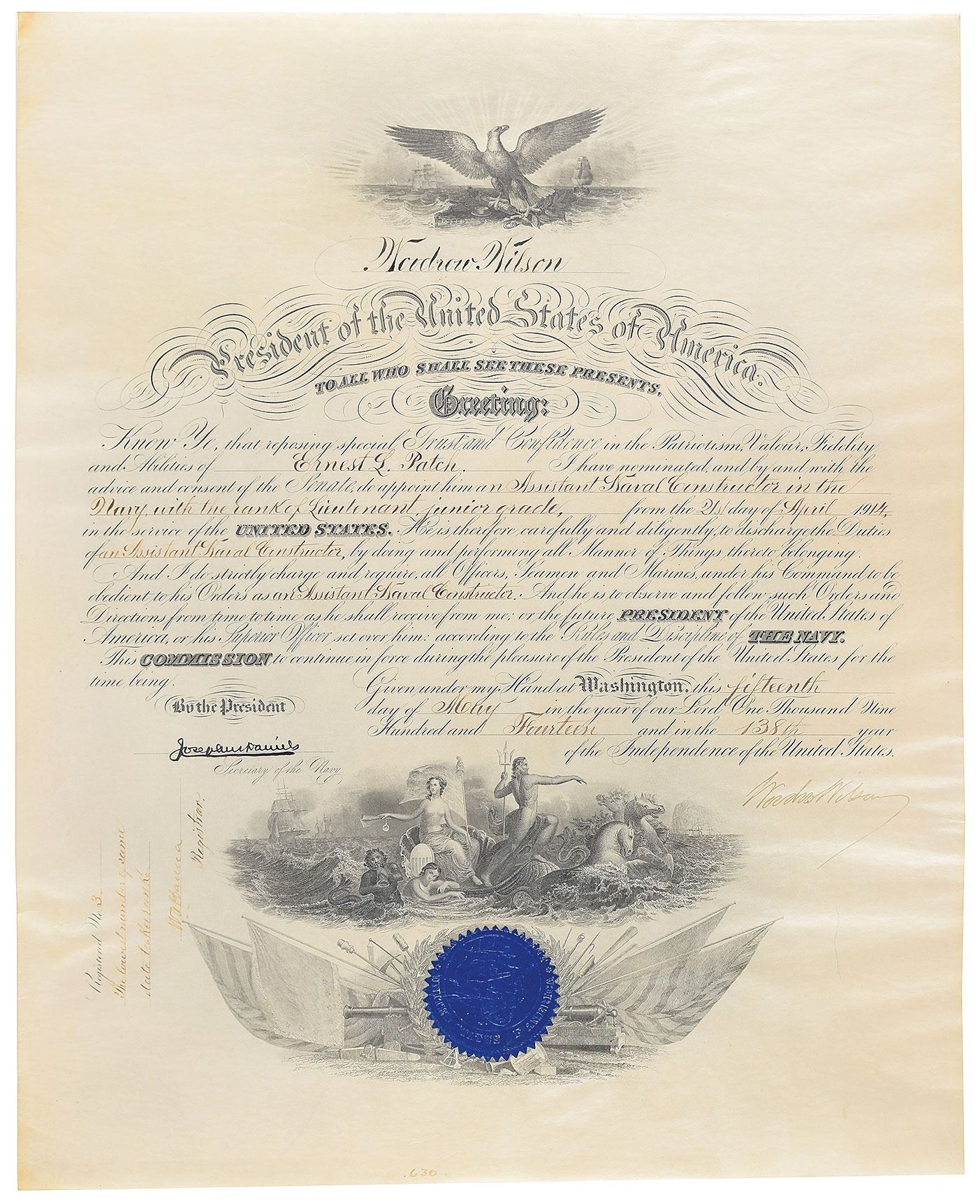 Partly-printed vellum DS as president, one page, 15.75 x 19.5, May 5, 1914. President Wilson appoints Ernest L. Patch as an "Assistant Naval Constructor in the Navy, with the rank of Lieutenant, junior grade." Signed neatly at the conclusion by Wilson, and countersigned by Secretary of the Navy Josephus Daniels. Dark blue Navy Department seal remains affixed to lower vignette. In fine condition.