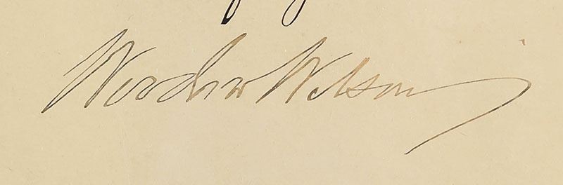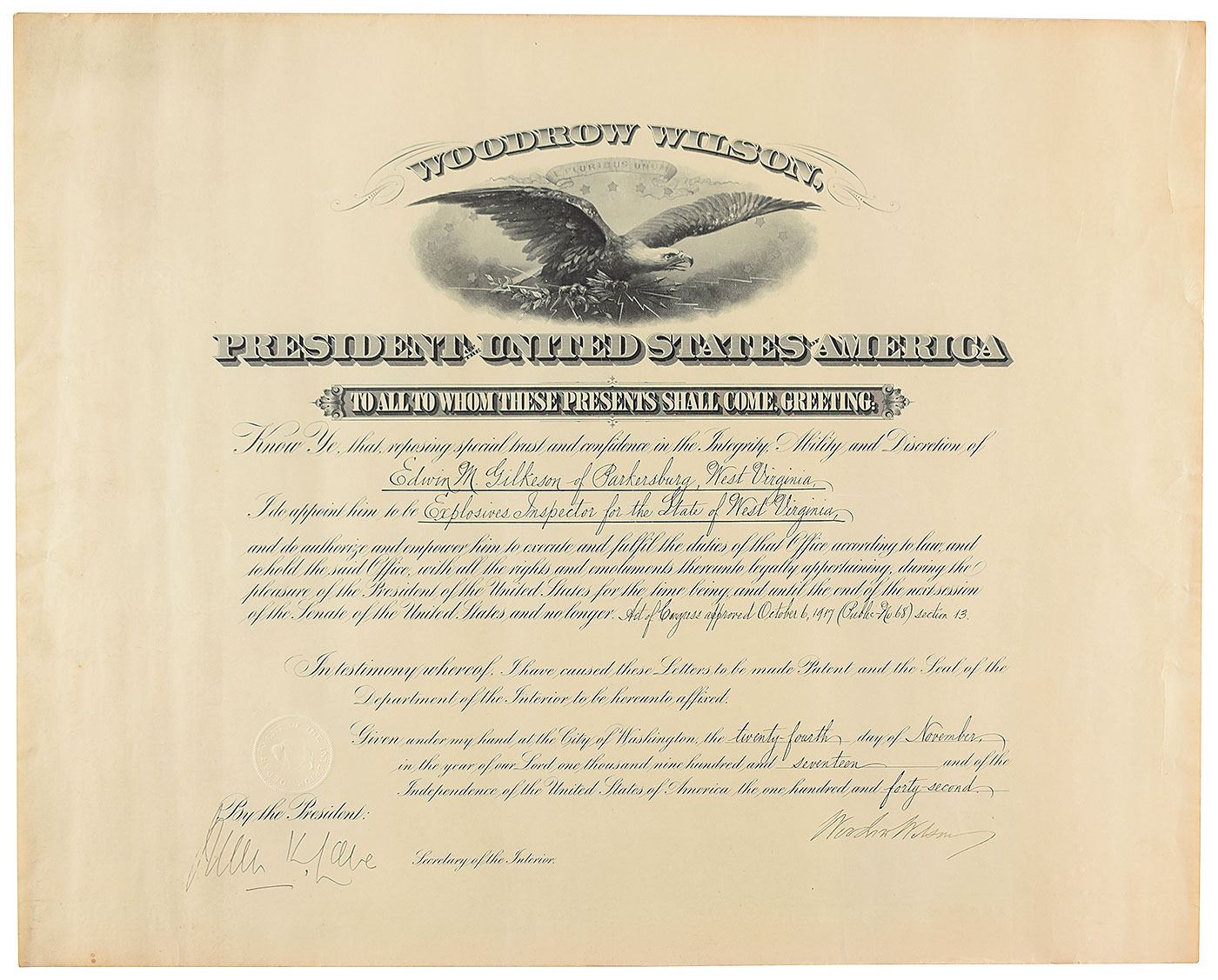 World War I-dated partly-printed DS as president, one page, 20 x 16, November 24, 1917. President Wilson appoints Edwin M. Gilkeson of Parkersburg, West Virginia as an "Explosives Inspector for the State of West Virginia." Signed at the conclusion by Wilson and countersigned by Secretary of the Interior Franklin K. Lane. Rolled and in very good to fine condition, with light edge creasing, and light toning to the left side.