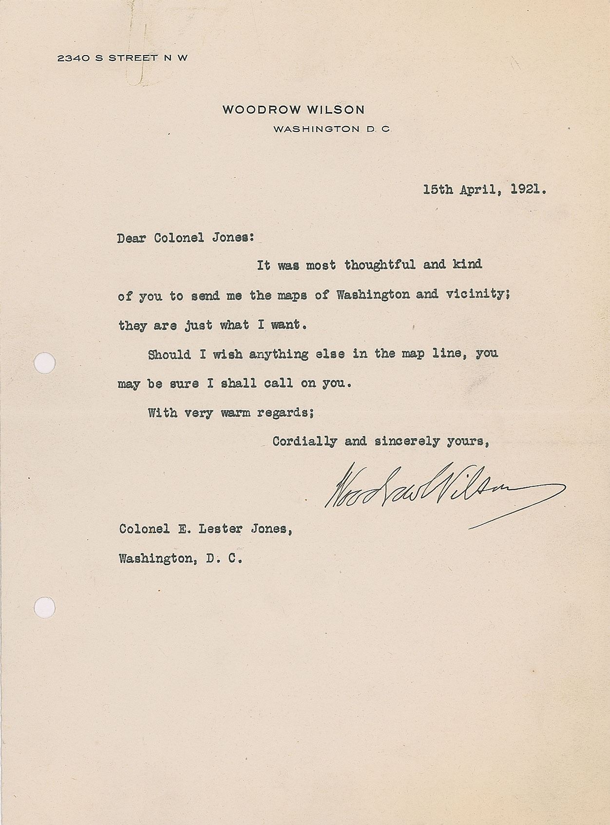 Two letters by Woodrow Wilson to E. Lester Jones: a TLS as president, one page, 7 x 8.75, White House letterhead, March 13, 1914, in part: "I take the liberty of dropping you just a line to express my interest in young Mr. Kuhn. I know you have thought of taking him with you on your trip this summer, and I want to say that I hope that you can find it possible to do so"; and a TLS, one page, 7 x 9.5, personal letterhead, April 4, 1921, in part: "It was most thoughtful and kind of you to send me the maps of Washington and vicinity; they are just what I want. Should I wish anything else in the map line, you may be sure I shall call on you." In fine condition, with two file holes to the left edge of each letter.