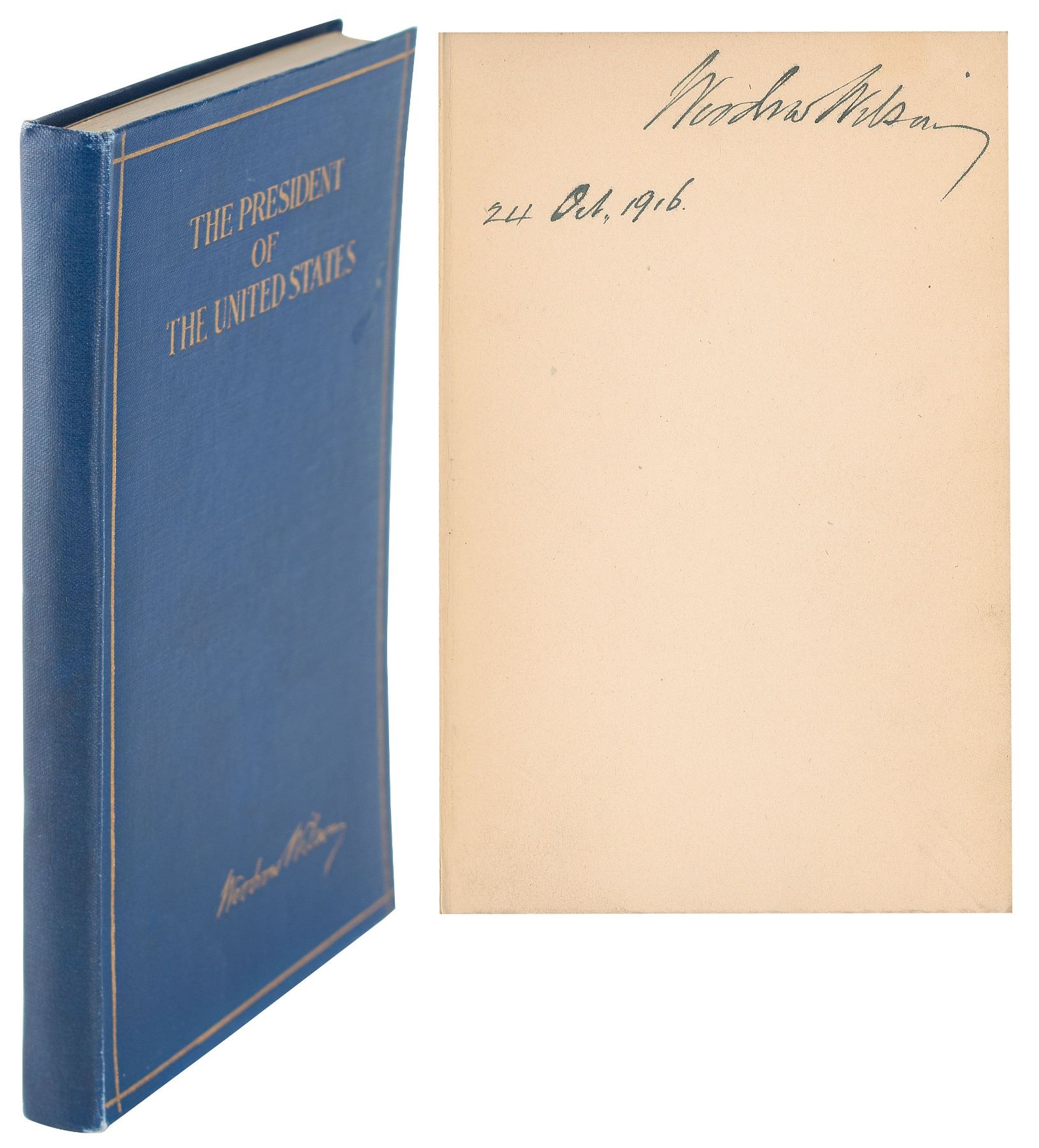 Signed book: The President of the United States. First edition. NY: Harper & Brothers, 1916. Hardcover bound in blue cloth with gilt stamping, with dust jacket, 4.5 x 7, 71 pages. Neatly signed on the first free end page in crisp fountain pen, "Woodrow Wilson, 24 Oct. 1916." Autographic condition: fine. Book condition: VG+/VG-, with a "Library of Lawrence E. Miller" blindstamp to a rear page, and significant creasing and paper loss to the jacket.