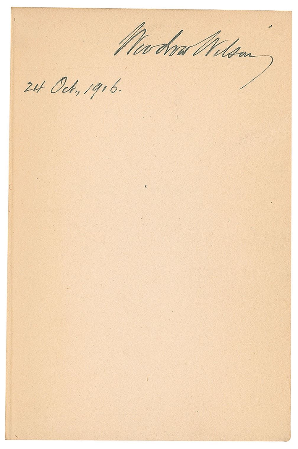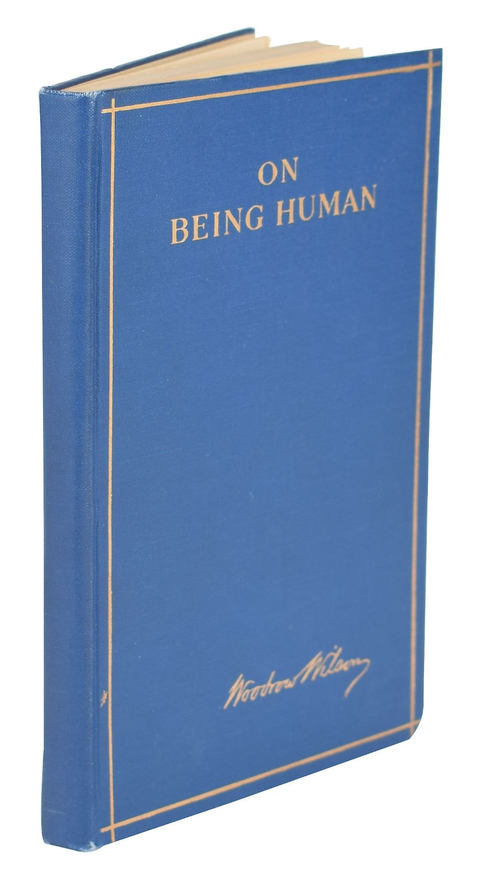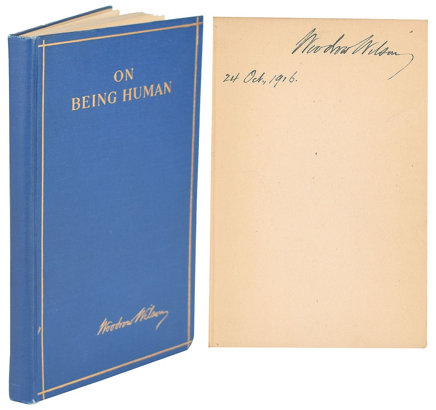 Signed book: On Being Human. First edition. NY: Harper & Brothers, 1916. Hardcover bound in blue cloth with gilt lettering, 4.75 x 7, 55 pages. Signed on the first free end page in ink, "Woodrow Wilson, 24 Oct., 1916." Autographic condition: fine. Book condition: VG+/None, with bumped bottom corners and a "Library of Lawrence E. Miller" blindstamp to a rear page.