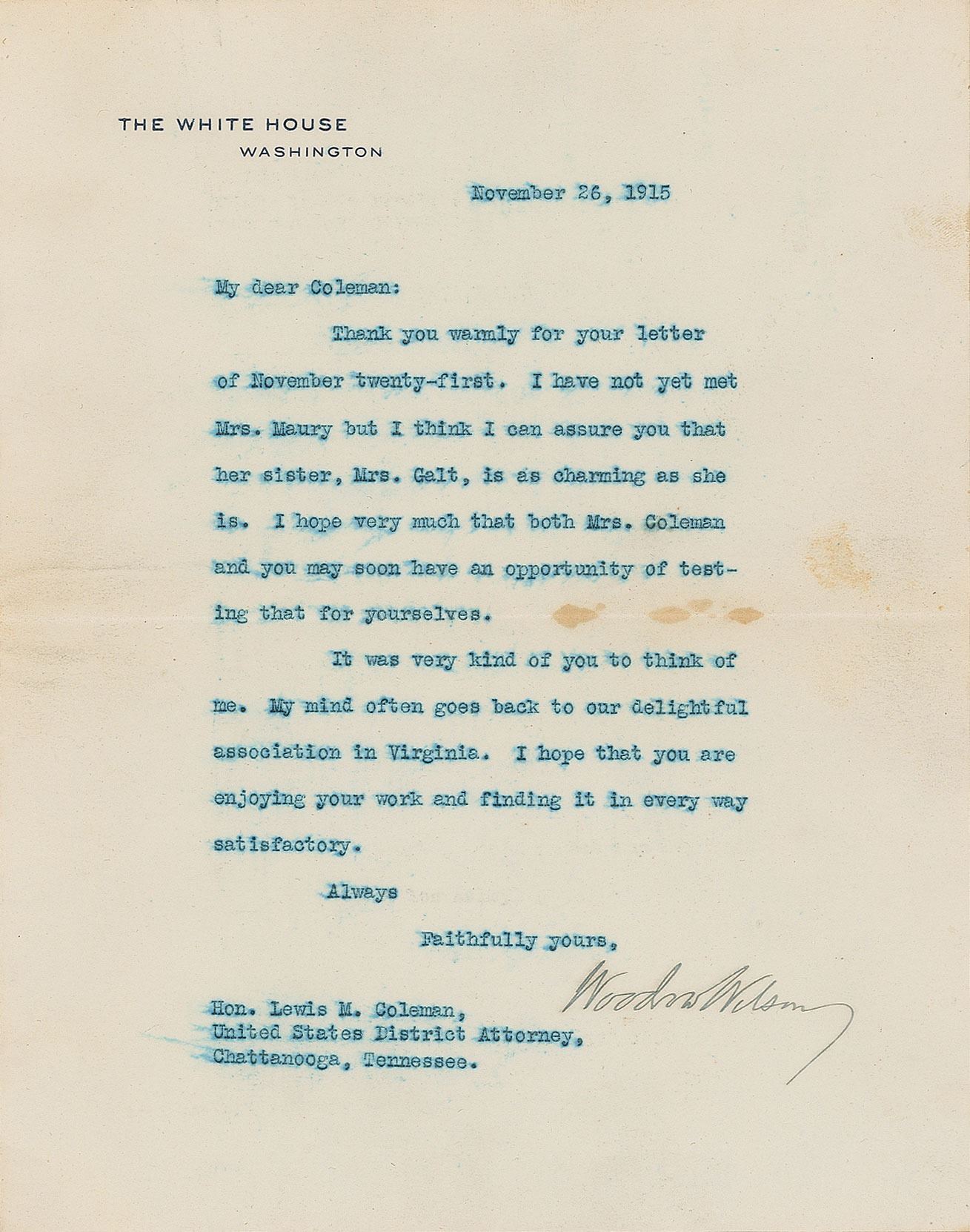 TLS as president, one page, 7 x 8.75, White House letterhead, November 26, 1915. Letter to the Hon. Lewis M. Coleman, US District Attorney in Chattanooga. In part: "I have not yet met Mrs. Maury but I think I can assure you that her sister, Mrs. Galt, is as charming as she is. I hope very much that both Mrs. Coleman and you may soon have an opportunity of testing that for yourselves. It was very kind of you to think of me. My mind often goes back to our delightful association in Virginia. I hope that you are enjoying your work and finding it in every way satisfactory." In very good to fine condition, with light staining, edge rippling, and slight blurring to the type.