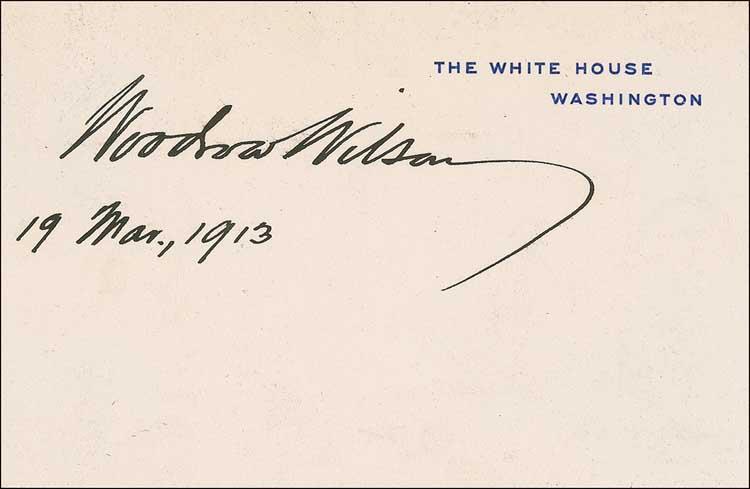 Signed White House card, signed in black ink, “Woodrow Wilson, 19 Mar., 1913.” A bit of scattered light toning and soiling, and mounting remnants on reverse, otherwise fine condition. Pre-certified John Reznikoff/PSA/DNA and RRAuction COA.