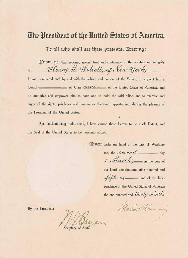 Partly-printed DS as president, one page, 10 x 13.75, March 2, 1915. President Wilson appoints Henry M. Wolcott “a Consul of Class nine of the United States of America.” Signed at the conclusion by Wilson, and countersigned by Secretary of State William Jennings Bryan. In fine condition, with a bit of trivial toning. The large embossed seal is crisp and intact. An unusual document format. Pre-certified John Reznikoff/PSA/DNA and RRAuction COA.