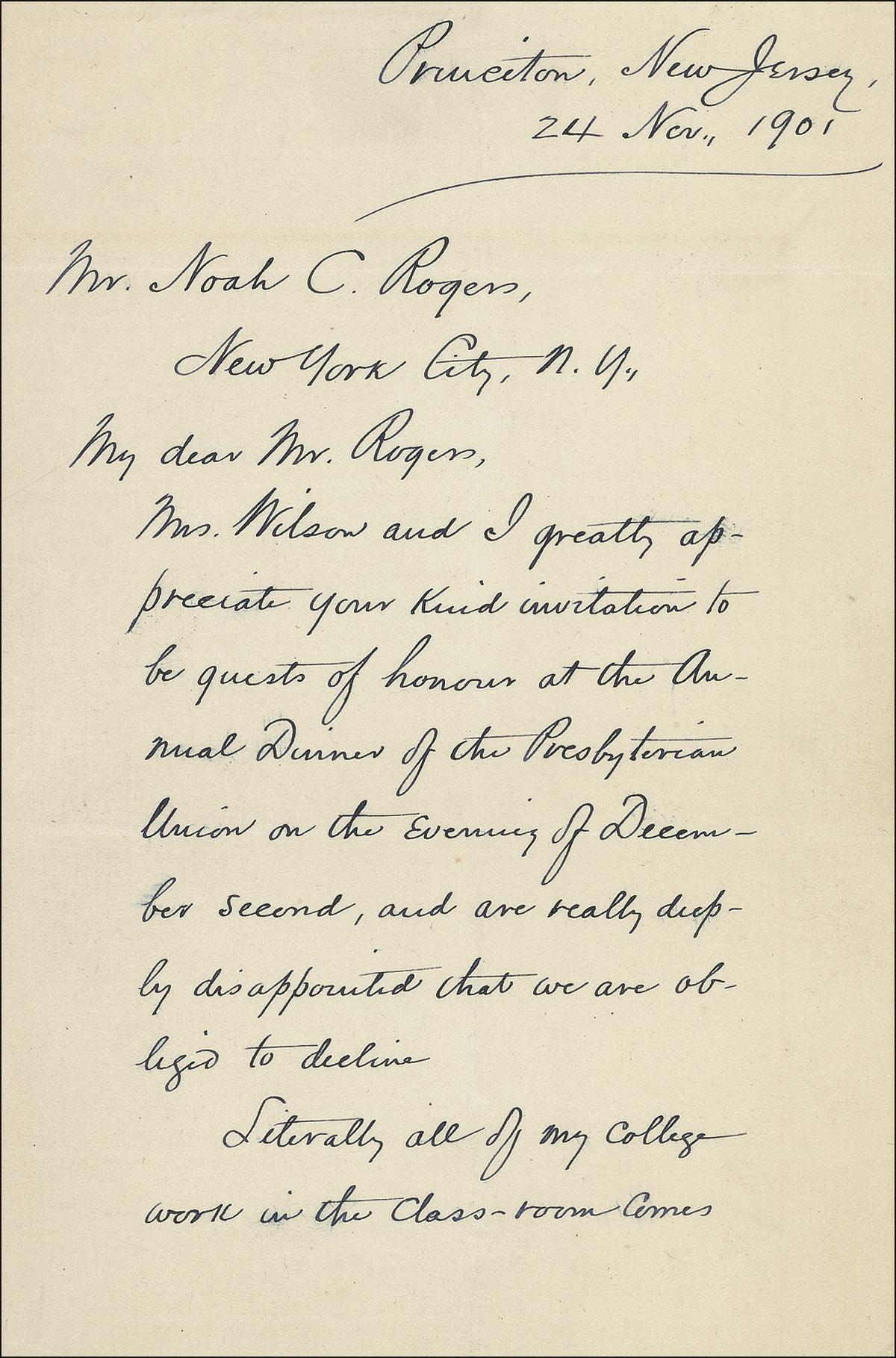 ALS, two pages, 5.25 x 7.75, November 24, 1901. Letter to Mr. Noah C. Rogers of New York City. In full: “Mrs. Wilson and I greatly appreciate your kind invitation to be guests of honor at the Annual dinner of the Presbyterian Union…and are very deeply disappointed that we are obliged to decline.