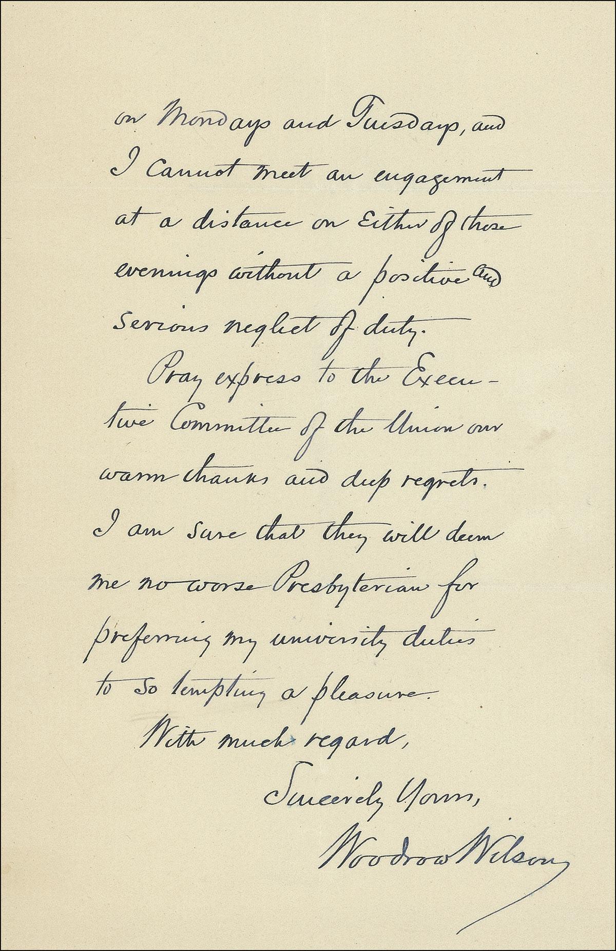 Pray express to the Executive Committee of the Union our warm thanks and deep regrets. I am sure that they will deem me no worse Presbyterian for performing my university duties to so tempting a pleasure.” Letter is archivally sleeved in acid-free Mylar. In fine condition, with intersecting folds and some very trivial toning.