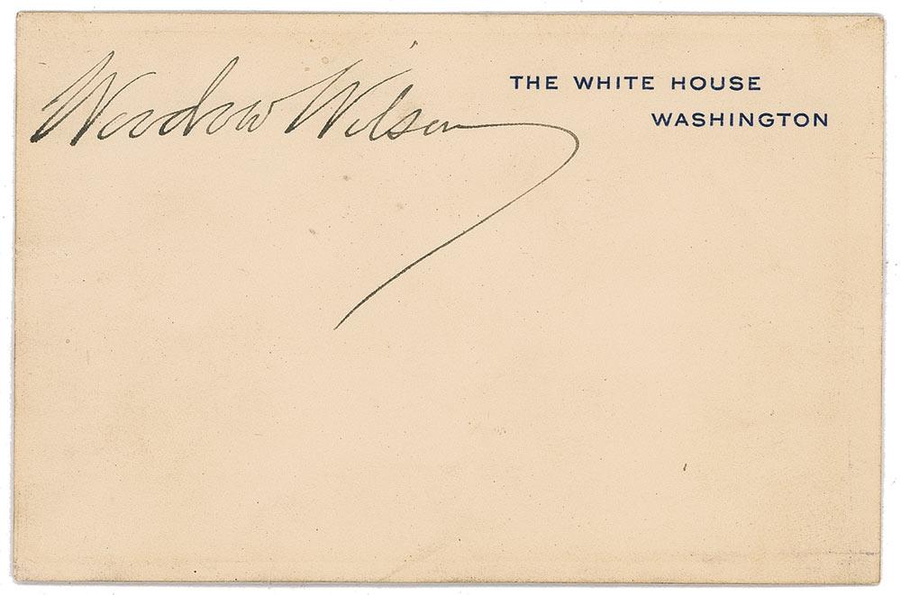 White House card, signed in fountain pen, “Woodrow Wilson.” In fine condition, lightly trimmed with faint toning and soiling.