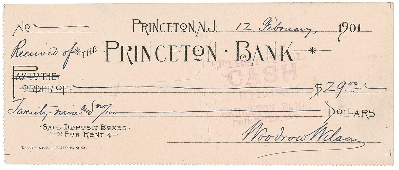 Bank check issued as a receipt, 7 x 3, filled out and signed by Wilson for $29.00, February 12, 1901. In very good condition, with cancellation cut to center and light stamp to center, and three vertical folds, one through a single letter of signature.