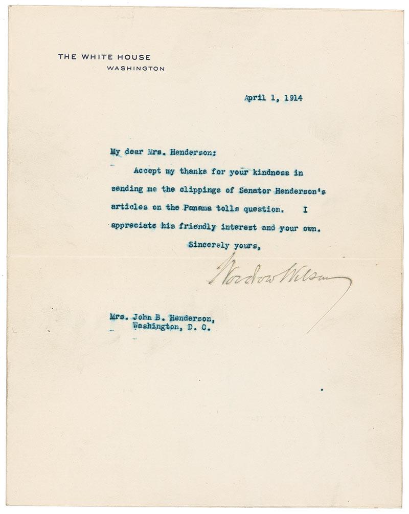 TLS as president, one page, 7 x 8.75, White House letterhead, April 1, 1914. Letter to Mrs. Mary F. Henderson, wife of late Senator John B. Henderson. In full: “My dear Mrs. Henderson: Accept my thanks for your kindness in sending me the clippings of Senator Henderson's articles on the Panama toll question. I appreciate his friendly interest and your own.” In very good condition, with light overall bleeding of typed text, mild feathering to signature, and some scattered light creasing and toning. Accompanied by the original mailing envelope. At that time, ships trading with the United States did not pay tolls to pass through the Panama Canal, a provision not specifically written into the Panama Canal Act of 1902. One month before this letter was written, President Wilson had addressed the joint sessions of Congress with an appeal to repeal those provisions of the Panama Canal Act interpreted to exempt certain ships from paying the toll. Accompanied by the original mailing envelope.