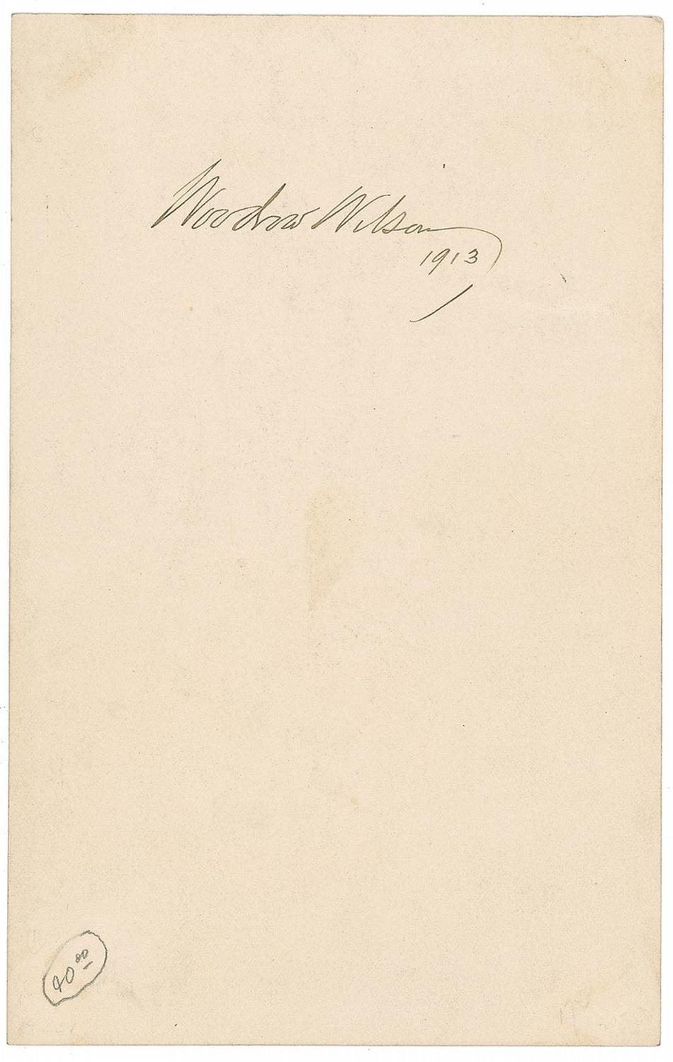 Vintage pearl-finish 5 x 7.75 portrait by Moffett Studio of Chicago, signed on the reverse in black ink, “Woodrow Wilson 1913.” In very good condition, with scattered silvering to darker areas of background and image, several creases and fingerprints, and a bit of light soiling to reverse.
