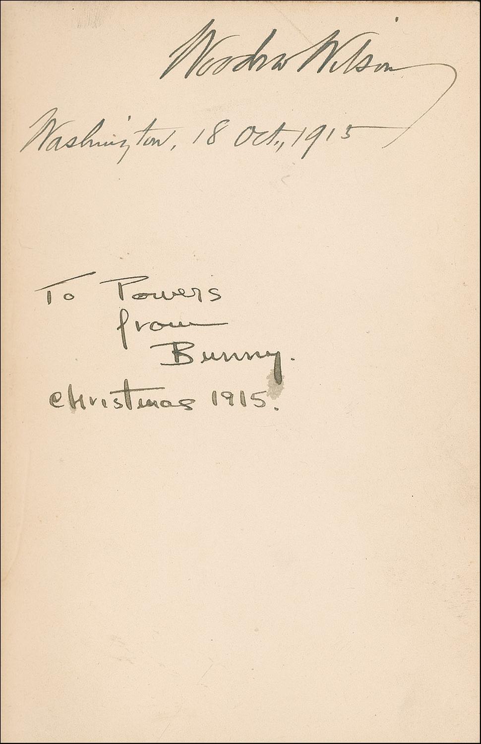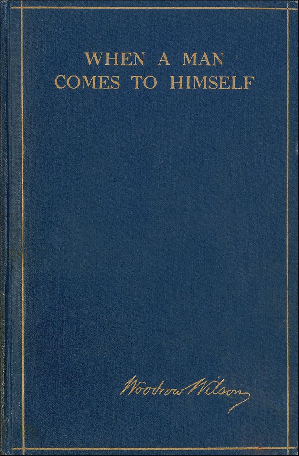 Signed book: When A Man Comes To Himself. Later printing. NY: Harper and Brothers, 1915. Hardcover, 4.5 x 7, 38 pages. Signed on the first free end page, “Woodrow Wilson, Washington, 18 Oct. 1915.” Gift inscription to signed page, owner’s bookplate affixed to inside back cover, adhesive remnant to last free end page, and a bit of trivial soiling to signed page, otherwise fine condition.
