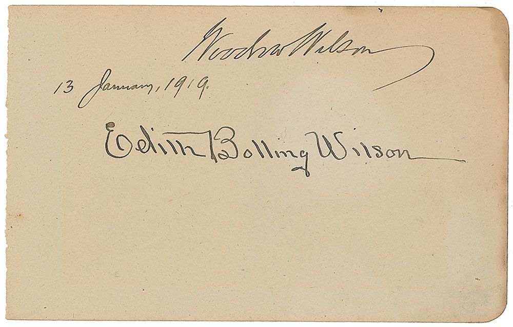 Ink signature, as president, “Woodrow Wilson, 13 January 1919,” and “Edith Bolling Wilson,” on an off-white 6 x 3.75 album page. A small hole between signatures and some mild toning, mainly to right side, otherwise fine condition.