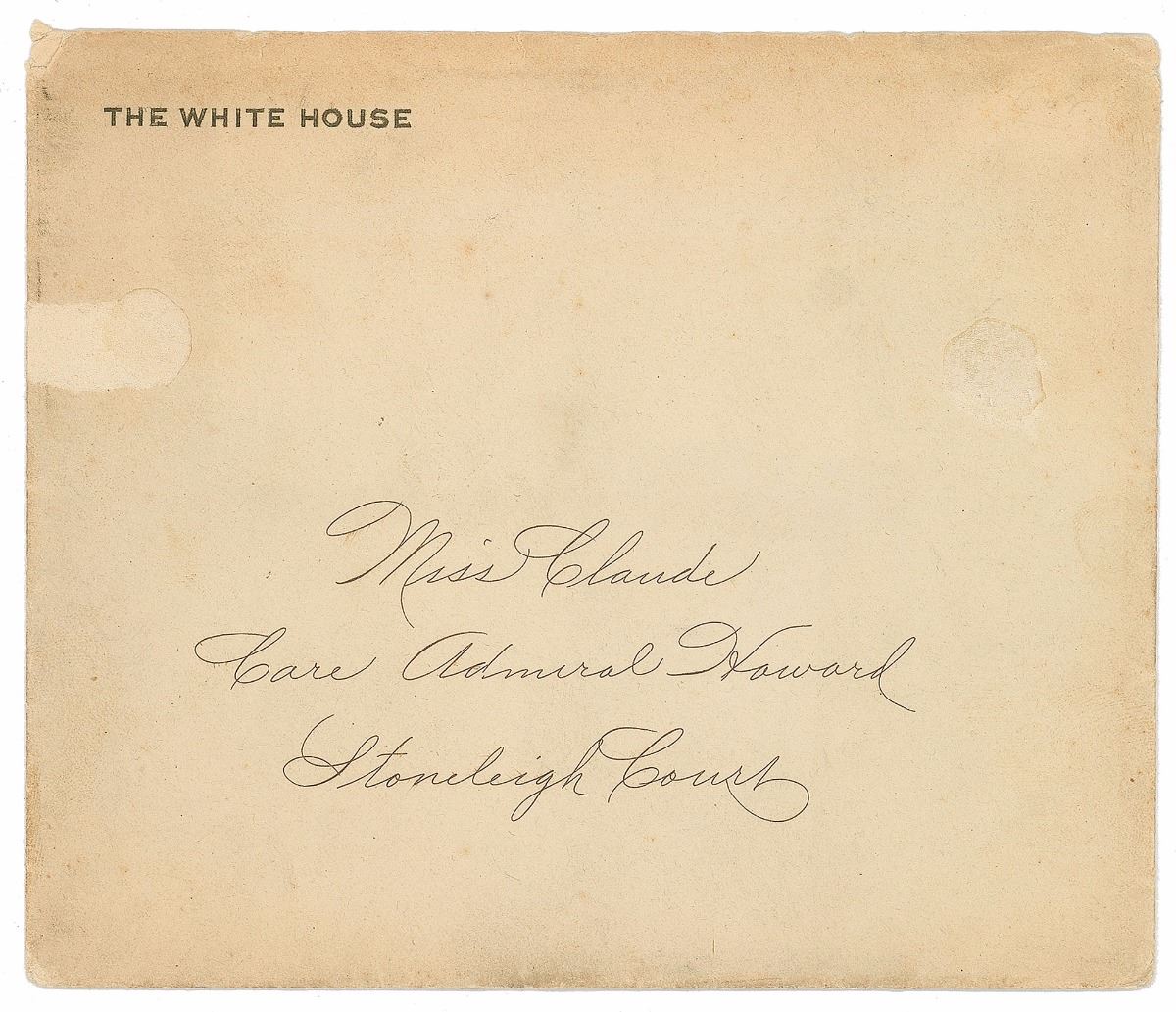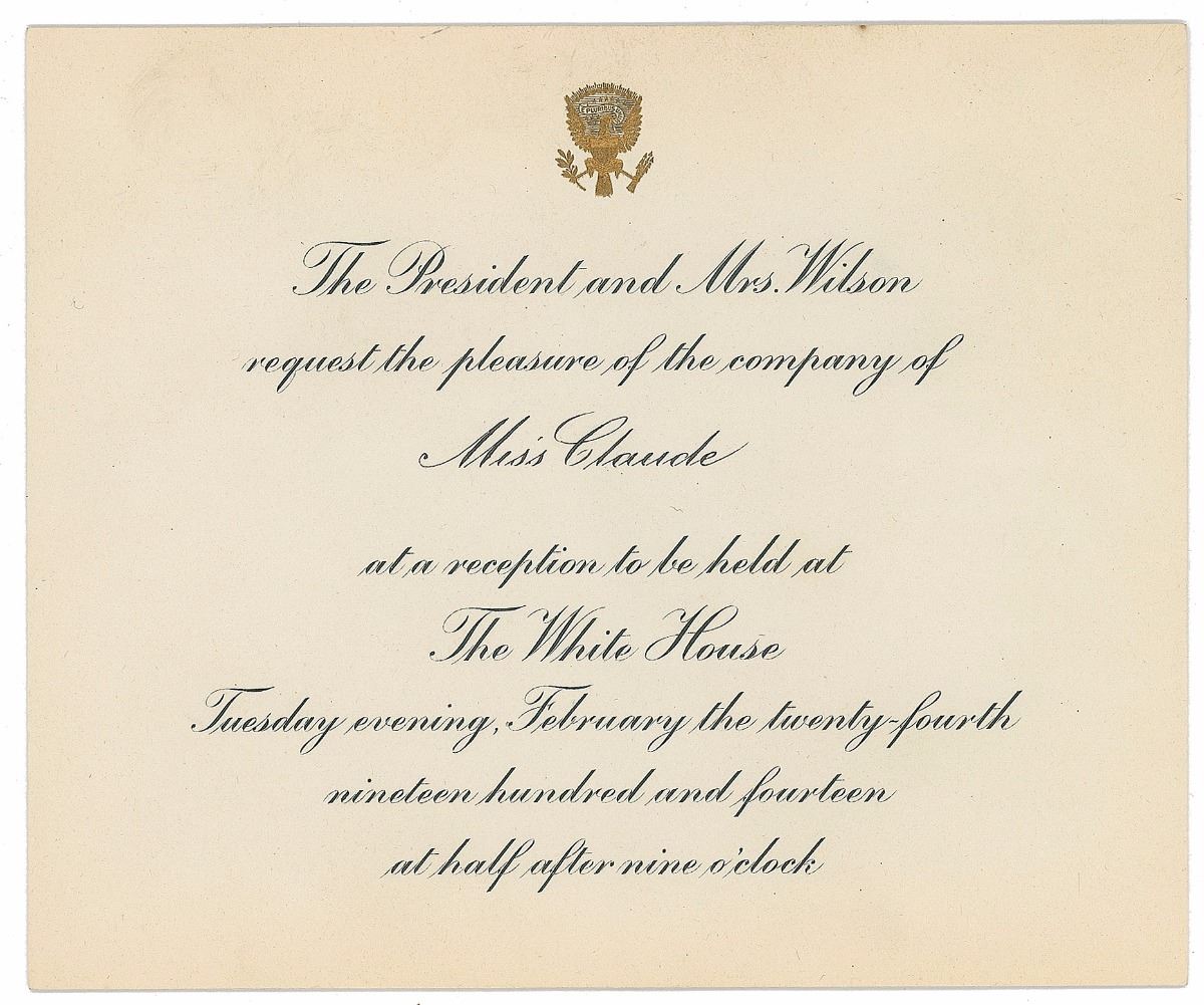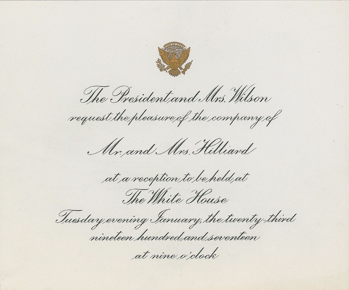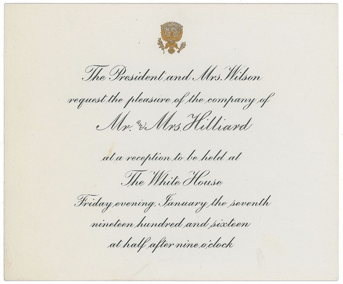 Three partly-printed invitations, unsigned, 5.5 x 4.75, dated 1914, 1916, and 1917. All are invitations from “The President and Mrs. Wilson” for receptions “to be held at The White House.” In overall fine condition, with light toning to one card. Accompanied by two original transmittal envelopes.