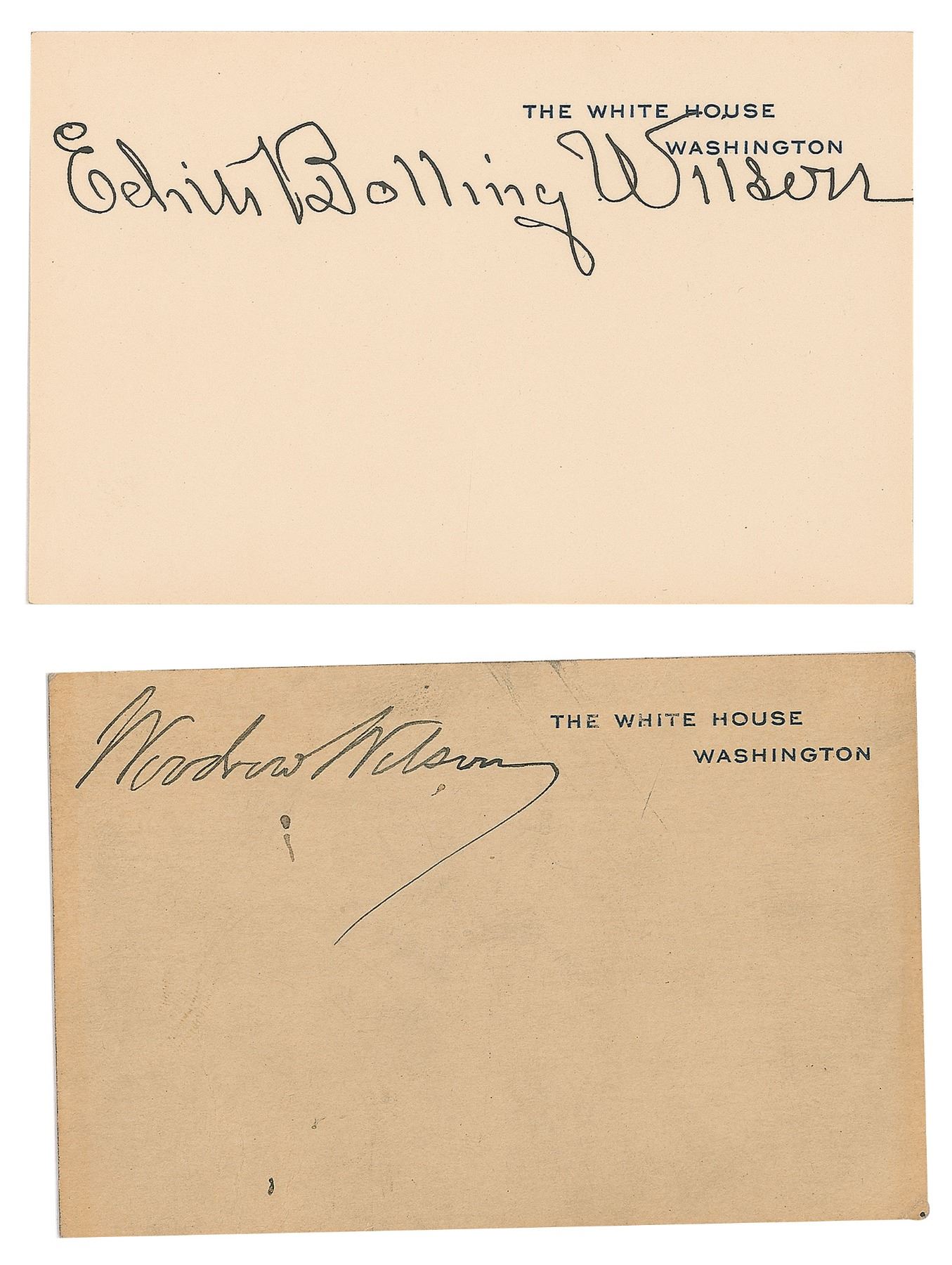 Two official White House cards, individually signed in ink by the president and first lady, "Woodrow Wilson" and "Edith Bolling Wilson." In overall very good to fine condition, with toning and soiling to the Woodrow Wilson card.