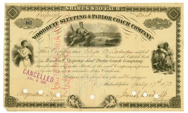 1873, Pennsylvania. Stock certificate for 10 shares. Black. Engraved vignette of seated indian overlooking a large riverside city, smaller vignettes of female figure and farmer at either side, cherubs at bottom. Signed by JONAH WOODRUFF, son of Theodore Woodruff, founder of the company. Pen cancelled and fine.