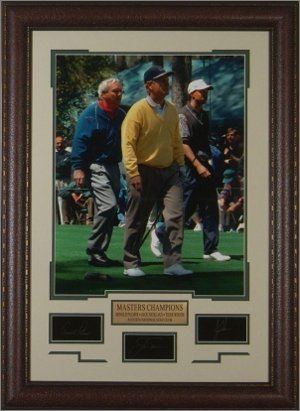 Tiger Woods, Arnold Palmer, and Jack Nicklaus custom premium leather framed unautographed Signature Engraved oversize 30x32 piece. Unique collectible of one of the all time golf greats with special engraved signature plates. Original 16x20" photograph of the 3 walking the fairway at Augusta National during Tiger Woods amateur appearance at the Masters.