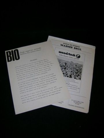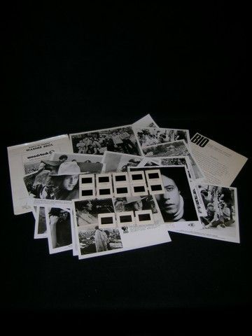From the Lester Glassner Collection. A collection of memorabilia and slides from the epic 1969 musical festival known as Woodstock. The lot includes (15) b&w stills (with one duplicate) from the 1970 movie 'Woodstock' (approx. 8"x10"); a lot of (13) color slides of stills from the film (with five having duplicates); (3) b&w photos featuring musician Arlo Guthrie (approx. 8"x10"); a typed, two page biography of Arlo Guthrie from Reprise Records; and a Spanish language fold out press book for the release of the film Woodstock (measures approx. 9" x 12") If you were there in the summer of '69, then this will surely bring back memories. Lester Glassner was a collector of Pop culture artifacts whose collection included movie posters, lobby cards, toys, and more than 250,000 movie stills.
