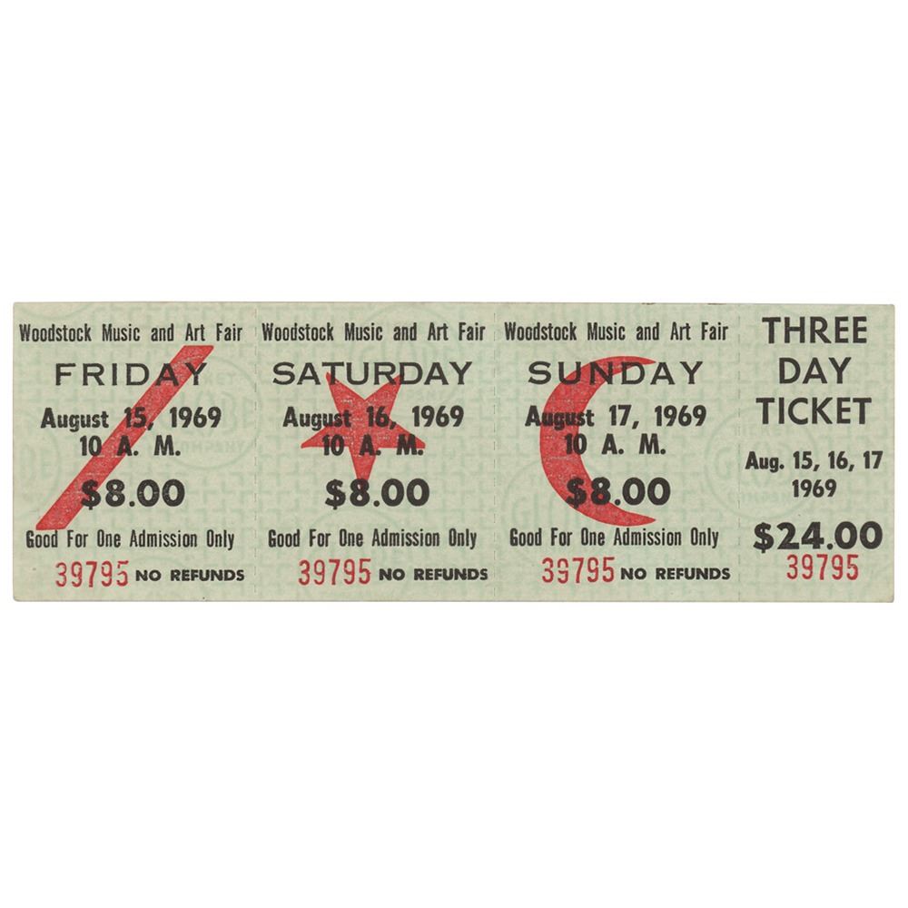 Original unused three-day admission ticket for the iconic Woodstock Music and Art Fair, 6 x 2, issued for August 15-17, 1969, numbered "39795." In fine condition.