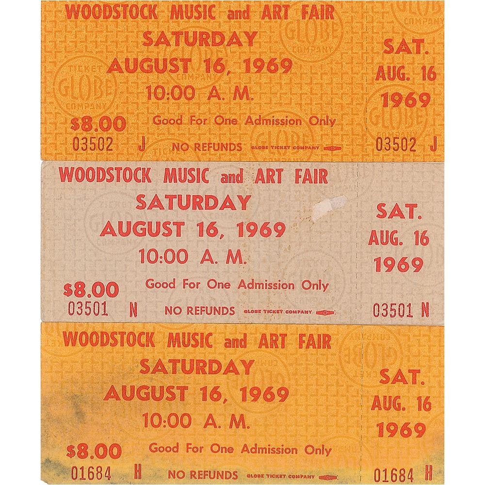Three original unused one-day admission tickets for the iconic Woodstock Music and Art Fair, each 5 x 2, issued for Saturday, August 16th, numbered "01684 H,” “03501 N,” and “03502 J.” In overall very good to fine condition, with some soiling to one ticket, and minor surface loss to another.