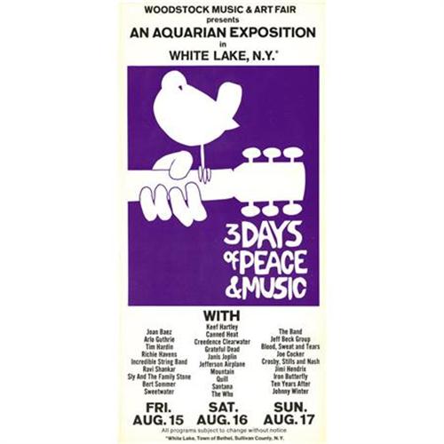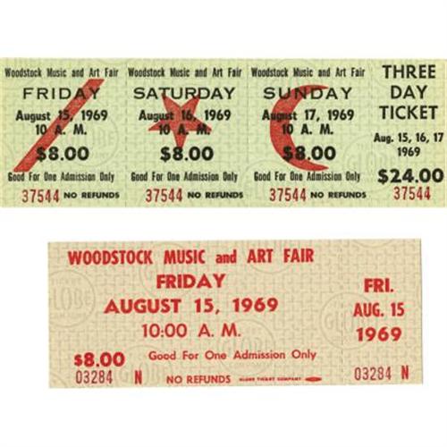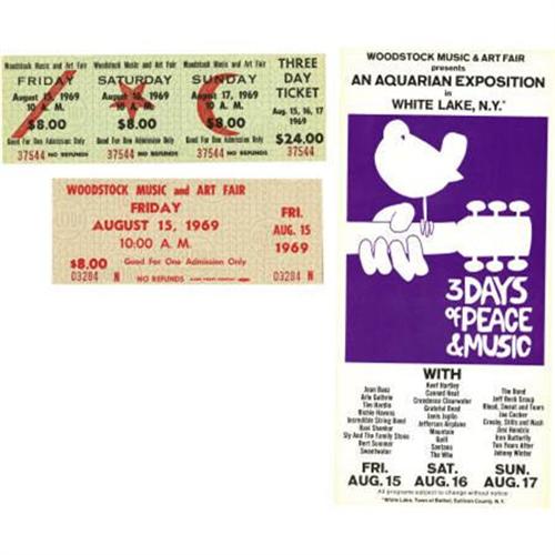<B>Woodstock Unused Ticket and Program Group (1969).</B></I> It's the concert event that helped define a generation -- the three-day Aquarian Exposition in upstate New York (the program brochure lists White Lake; the actual site was near Bethany). Included in this groovy lot are one unused Friday ticket, light brown with red ink, number 03284 N, and a three day ticket, green with red and black ink, number 37544, and the four-page program brochure, purple and black ink on white stock. Both tickets have stubs intact, and are printed with the Globe Ticket Company imprint. All three items are in NM- condition or better.<BR><BR><b>Shipping:</b> Flat Material, Small (<a target="_blank" href="http://www.heritageauctions.com/common/shipping.php">view shipping information</a>)