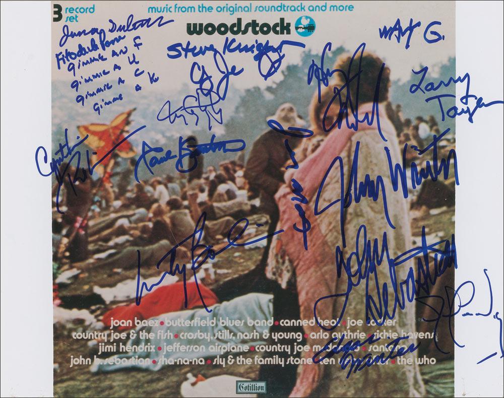 Color glossy 14 x 11 photo of the soundtrack’s album cover, signed in blue felt tip by 16 performers: Johnny Winter, Edgar Winter, John Sebastian, Jack Cassady, Paul Kantner, Marty Balin, Wavy Gravy, Country Joe McDonald, Juma Sultan, Fito de la Parra, Larry Taylor, Harvey Mandel, Steve Knight, Tom Constanten, Cynthia Robinson, and Jerry Martini. In fine condition, with some light soiling to lower right corner.