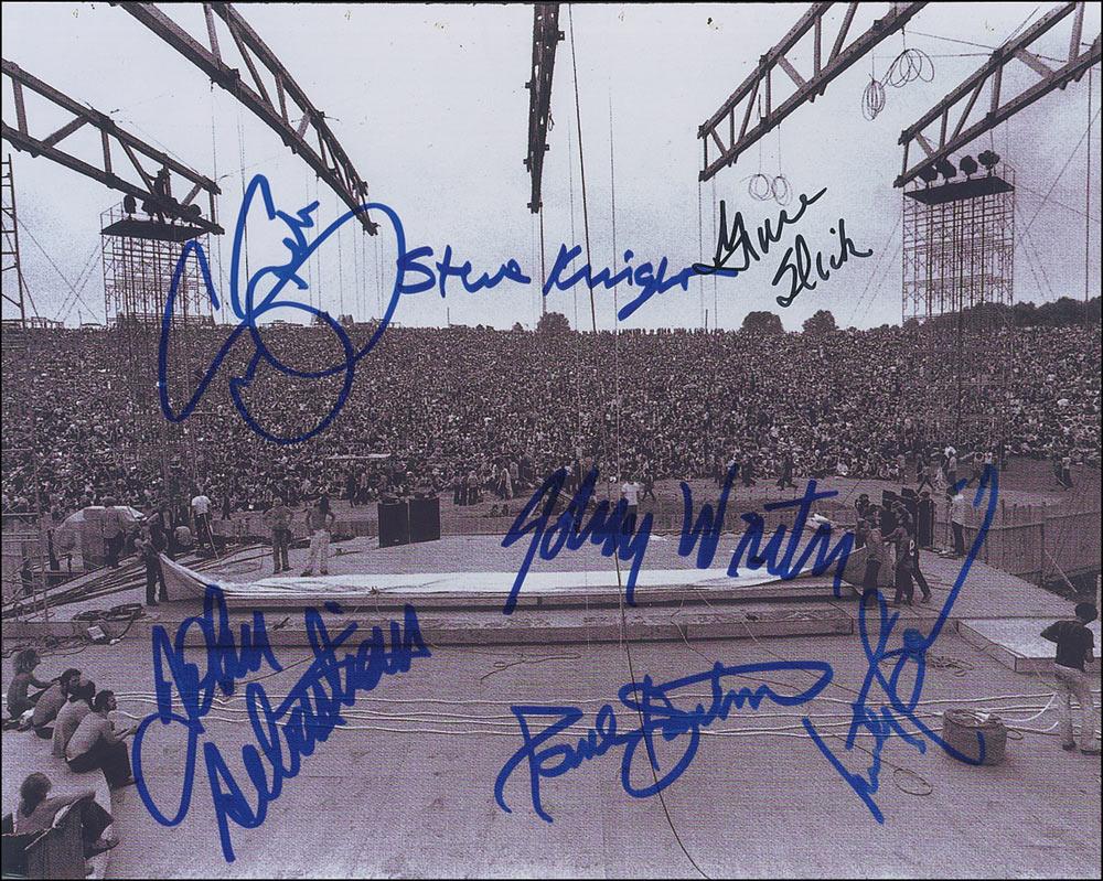 Color glossy 10 x 8 photo taken from backstage at Woodstock, signed in black felt tip by Grace Slick and in blue felt tip by Steven Stills, Johnny Winter, John Sebastian, Marty Balin, Paul Kantner, and Steve Knight. In fine condition.
