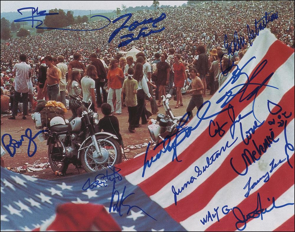 Color glossy 14 x 11 photo of the Woodstock crowd, signed in blue felt tip by 14 performers: Pete Townshend, Tommy Shannon, Marty Balin, Harvey Mandell, Country Joe McDonald, Melanie, Larry Lee, Wavy Gravy, Jim Fielder, Juma Sultan, David Sanborn, Bowzer Bauman, Tom Constanten, and John Sebastian. In very fine condition.