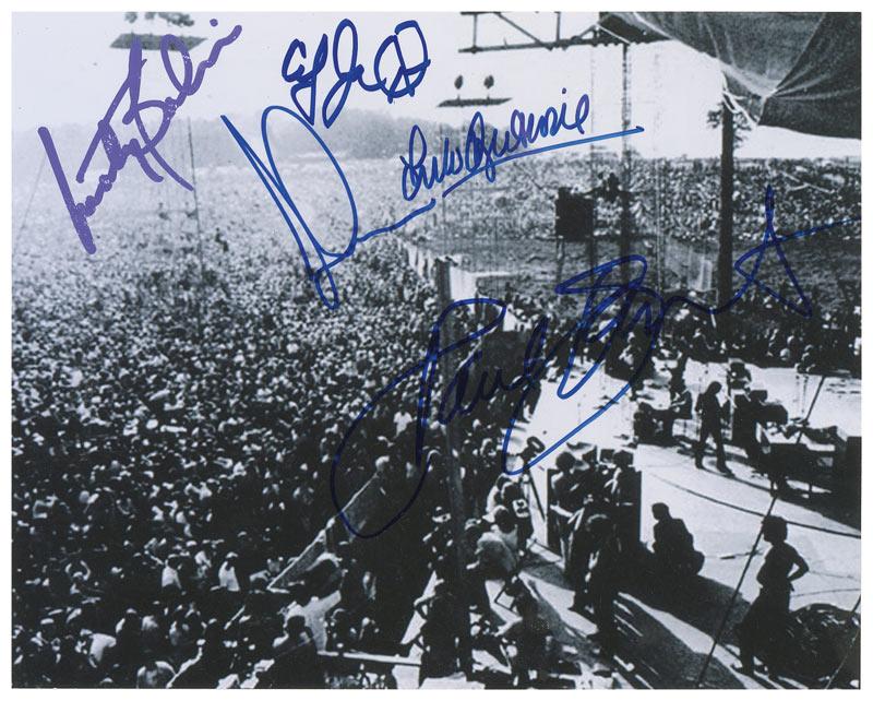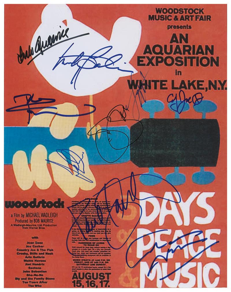 Color glossy 11 x 14 photo of a Woodstock poster, signed in felt tip by nine performers including: Pete Townshend, Arlo Guthrie, Country Joe McDonald, and Stephen Stills; and a glossy 10 x 8 photo of the Woodstock audience, signed in felt tip by five performers including Marty Balin, Arlo Guthrie, and Country Joe McDonald. In fine condition.