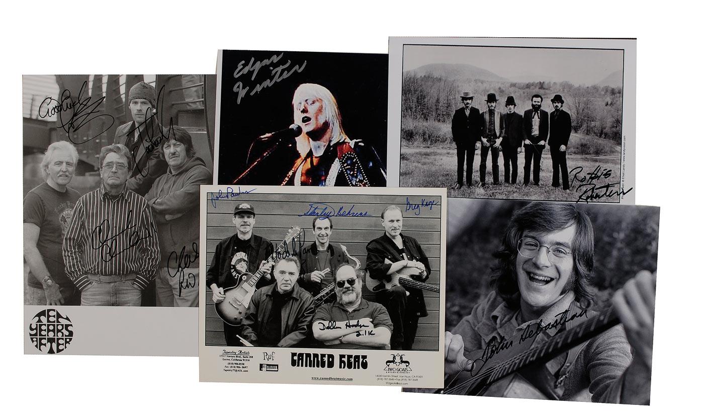 Five signed photos, various finishes, ranging in size from 8 x 10 up to 8.25 x 12, each signed in ink or felt tip by the respective musician(s) pictured. Signers are: Robbie Robertson, John Sebastian, Edgar Winter, all five members of Canned Heat, and all four members of Ten Years After. In fine condition.