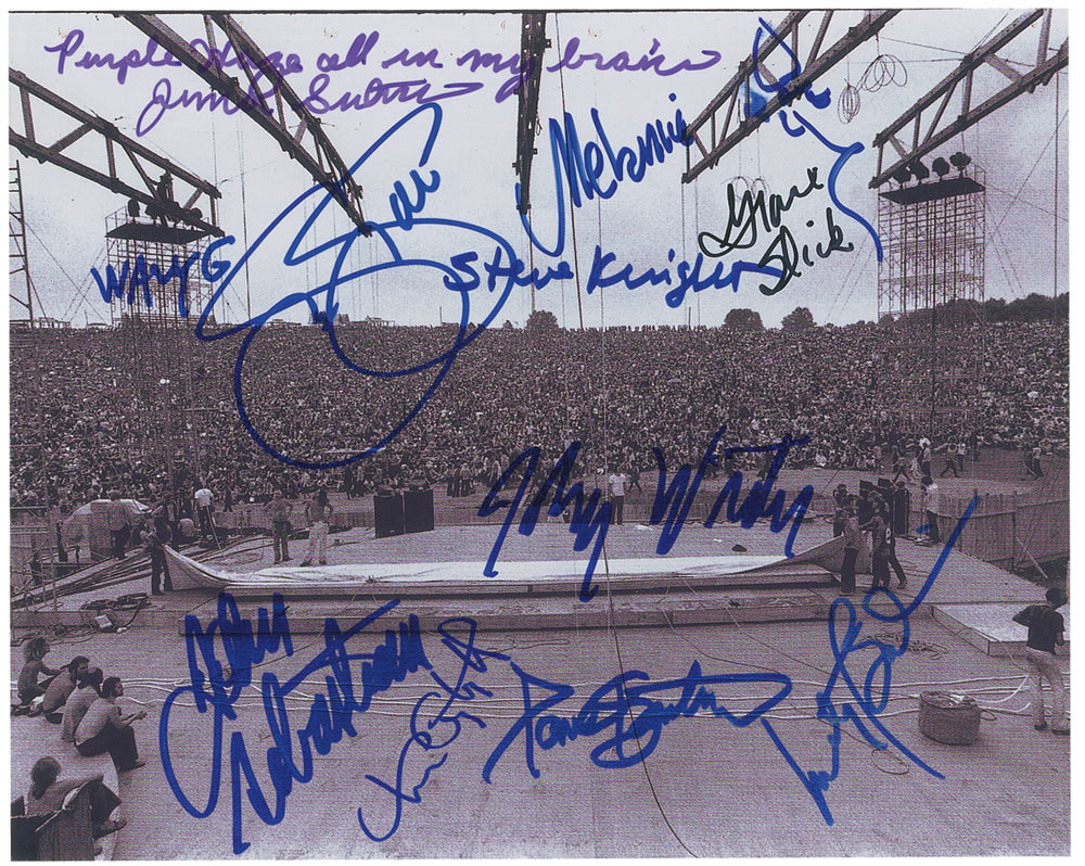 Glossy 10 x 8 photo of stage set-up in progress before a huge crowd, signed in felt tip by 11 performers. Signers are: Steven Stills, Grace Slick, Wavy Gravy, Melanie (adding a flower), John Sebastian, Paul Kantner, Marty Balin, Johnny Winter, Juma Sultan (adding “Purple haze all in my brain”), Steve Knight, and Tom Constanten. In fine condition.