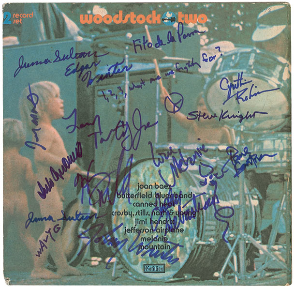 Woodstock Two album signed on the front cover in blue felt tip by 16 performers. Signers are: Arlo Guthrie, Country Joe (adding “1, 2, 3, what are we fighting for?”), Johnny Winter, Edgar Winter, Wavy Gravy, John Sebastian, Juma Sultan (2), Paul Kantner, Melanie (adding a flower), Fito de la Parra, Harvey Mandell, Larry Taylor, Jerry Martini, Cynthia Robinson, and Steve Knight. Mild wear and light paper loss to the edges, and a small discount cut to the lower spine, otherwise fine condition. The record is not included.