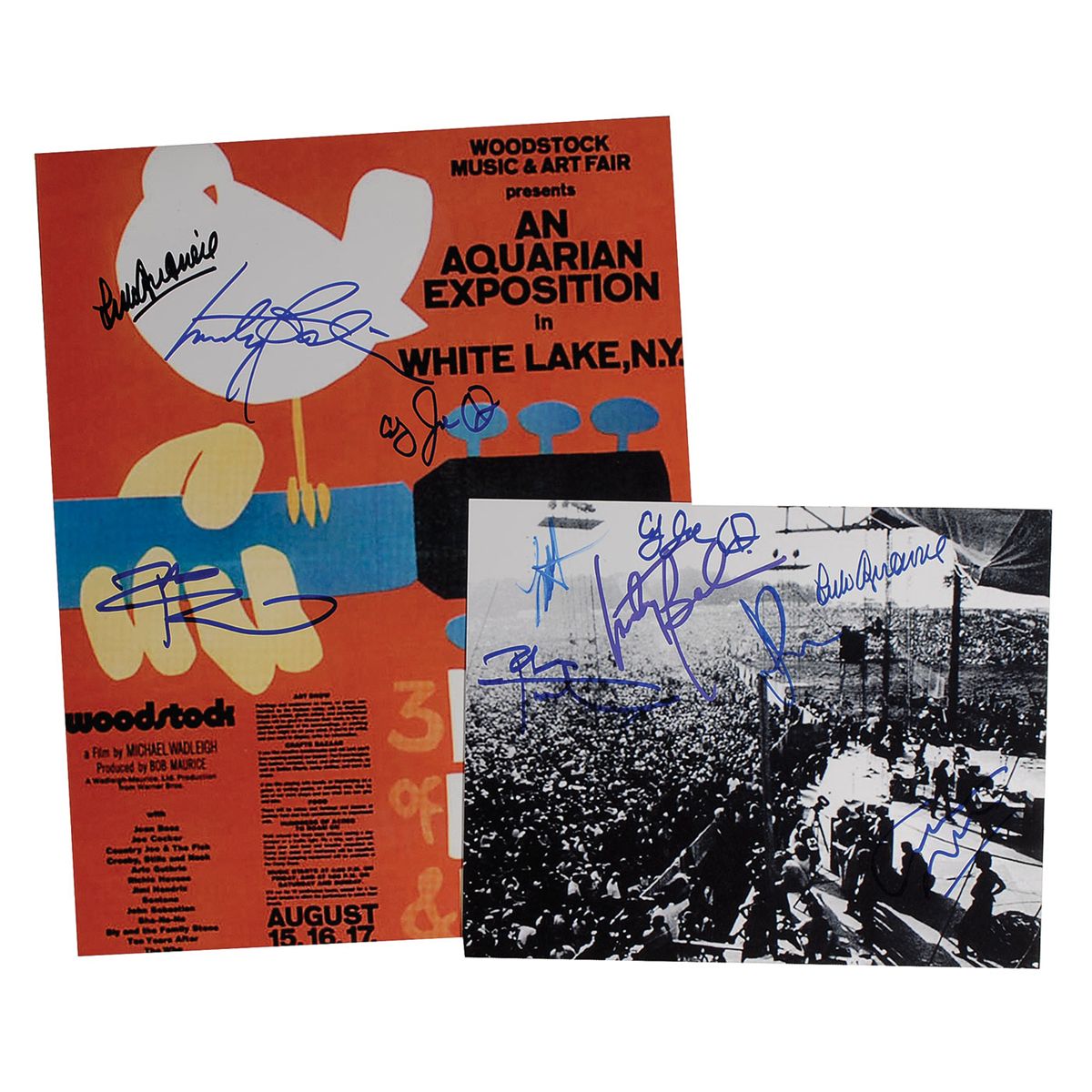 Color glossy 11 x 14 photo of a Woodstock poster, signed in felt tip by Arlo Guthrie, Marty Balin, Country Joe McDonald, and Pete Townshend; and a glossy 10 x 8 photo of a portion of the crowd, signed in felt tip by Arlo Guthrie, Marty Balin, Country Joe McDonald, Pete Townshend, Jorma Kaukonen, Leslie West, Graham Nash, and Pete Townshend. In fine condition.