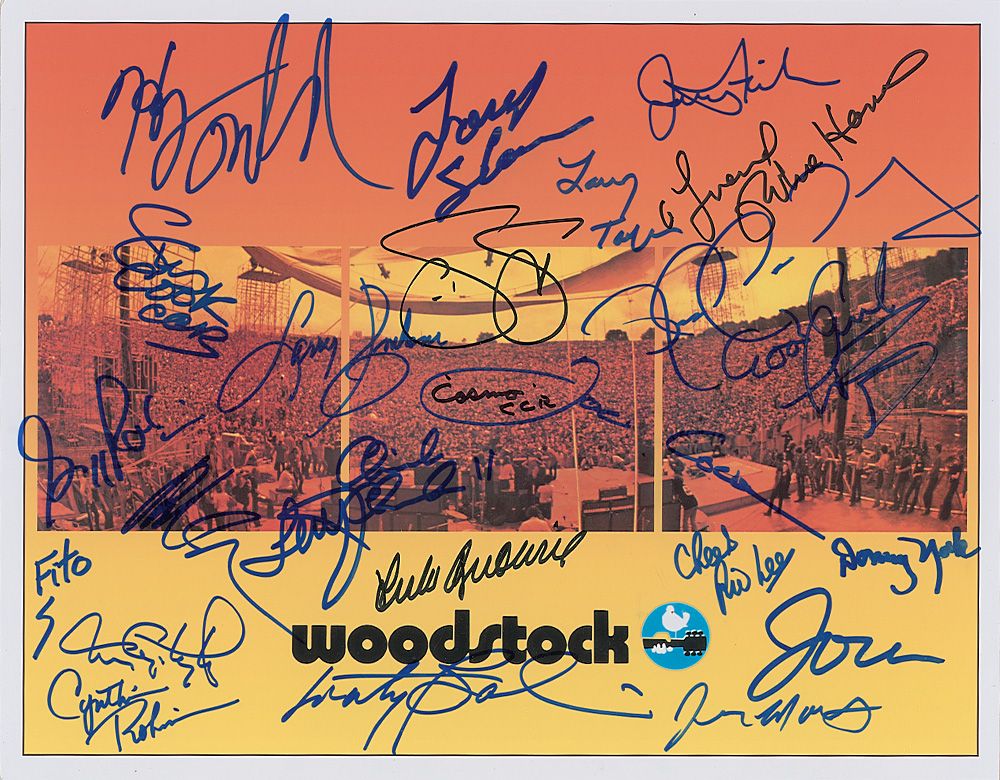 Color satin-finish 14 x 11 artistic photo of the stage and crowd at Woodstock, signed in blue and black felt tip by 25 participants. Signers are: Joe Cocker; Stephen Stills of CSNY; Arlo Guthrie; Richie Havens; Jefferson Airplane’s Jack Casady and Marty Balin; Creedence Clearwater Revival’s Doug Cosmo Clifford and Stu Cook; Gregg Rolie of Santana; Tom Constanten of Grateful Dead; Sly & the Family Stone’s Larry Graham, Jerry Martini and Cynthia Robinson; Canned Heat’s Fito de la Parra, Harvey Mandel and Larry ‘The Mole’ Taylor; Ten Years After’s Ric Lee, Leo Lyons and Chick Churchill; Sha Na Na’s Jocko and Donny York; Tommy Shannon of the Johnny Winter Band; David Sanborn of Butterfield Blues Band; and Blood Sweat and Tears’ Jim Fielder and Steve Katz. In fine condition.