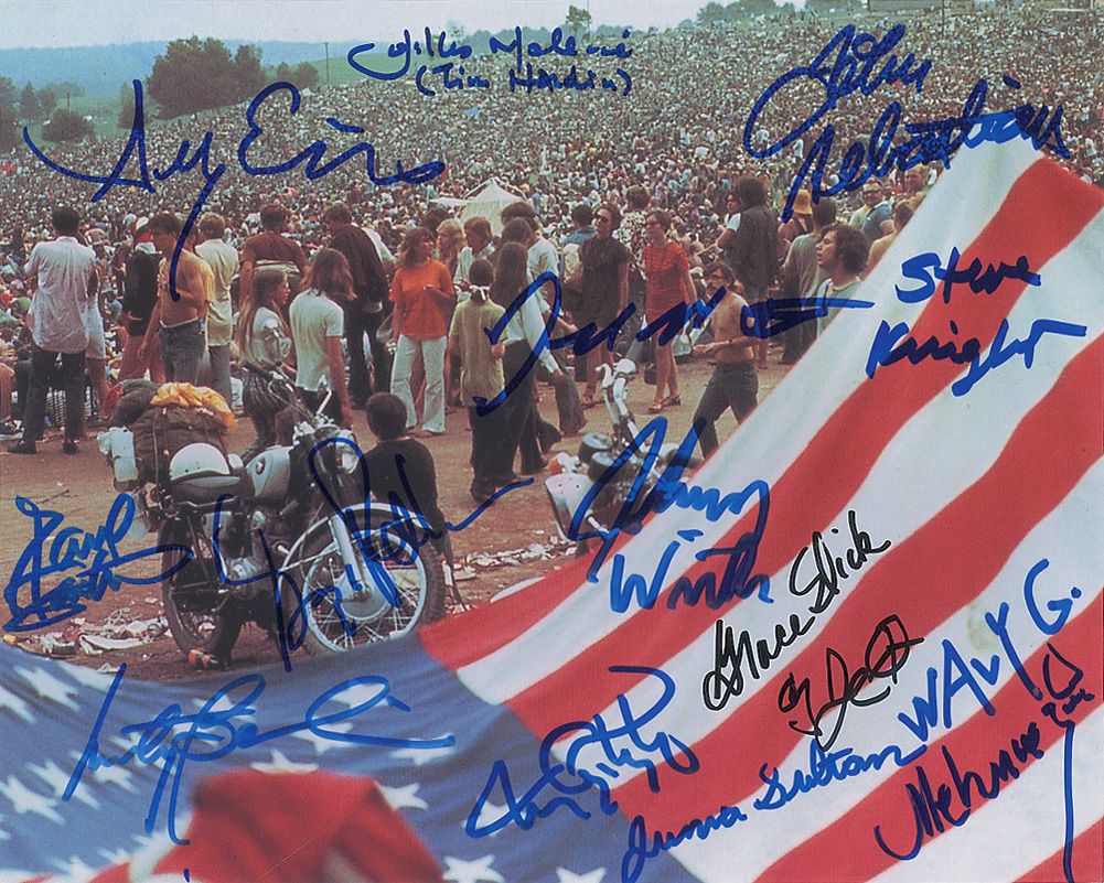 Color glossy 10 x 8 photo of the crowd at Woodstock, signed in blue and black felt tip by 15 of the musicians who played there. Signers are: Grace Slick, Wavy Gravy, Melanie, Johnny Winter, Country Joe McDonald, Paul Kantner, Marty Balin, John Sebastian, Juma Sultan, Greg Errico, Jerry Martini, Gregg Rolie, Tom Constanten, Steve Knight, and Gilles Malkine. In fine condition.