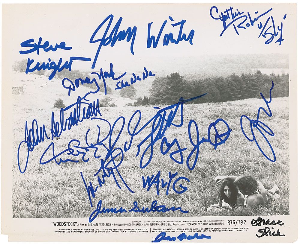 Glossy 10 x 8 Warner Bros. promotional photo for the Woodstock film, signed in blue felt tip by 14 performers: Grace Slick (black felt tip), Johnny Winter, John Sebastian, Marty Balin, Country Joe McDonald, Leslie West, Wavy Gravy, Donny York, Steve Knight, Juma Sultan, Jocko, Jerry Martini, Cynthia Robinson, and Tom Constanten. In fine condition, with some scattered light creases and surface impressions.