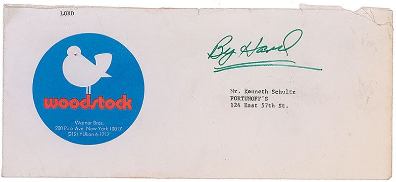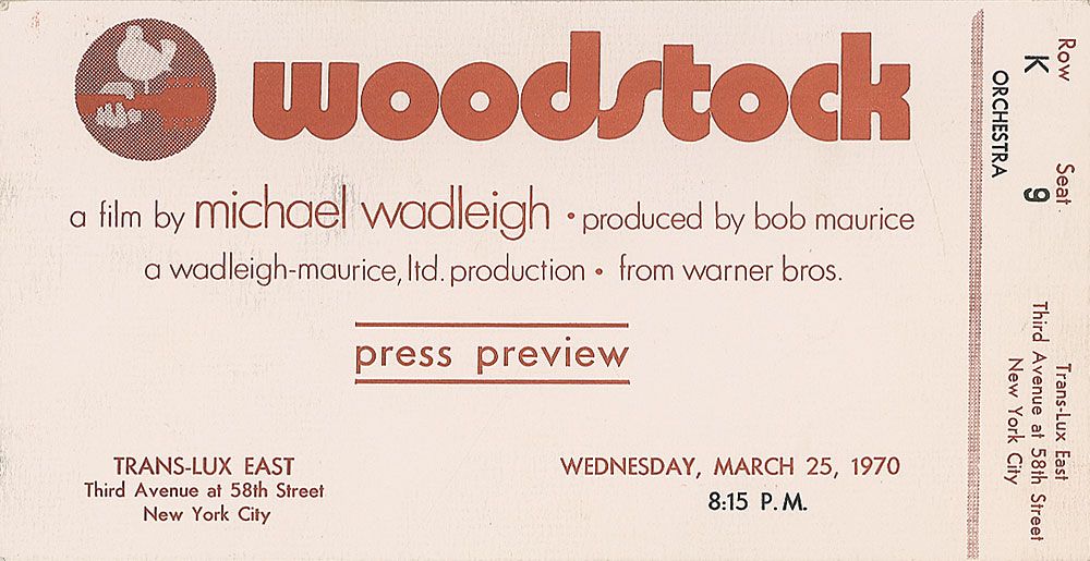 Original ticket, 7.75 x 4, for a press preview to Michael Wadleigh’s famous Woodstock documentary, held at Trans-Lux East in New York on March 25, 1970. The film was officially released the next day. In fine condition. Accompanied by the original envelope, which bears a Woodstock logo.