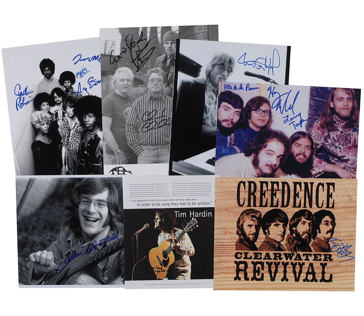 Seven photos of various finishes, three color, ranging in size from 6.75 x 8 to 8.25 x 11.75, each signed by the Woodstock performer pictured. Signers are: Stu Cook and Doug ‘Cosmo’ Clifford of Creedence Clearwater Revival; Jerry Martini, Greg Errico, Cynthia Robinson, and Freddie Stone of Sly and the Family Stone; John Sebastian; Gilles Malkine; Tom Constanten; Leo Lyons, Chick Churchiill, Ric Lee, and Joe Gooch of Ten Years After; and Fito de la Parra, Larry Taylor, and Harvey Mandel of Canned Heat. In overall fine condition.