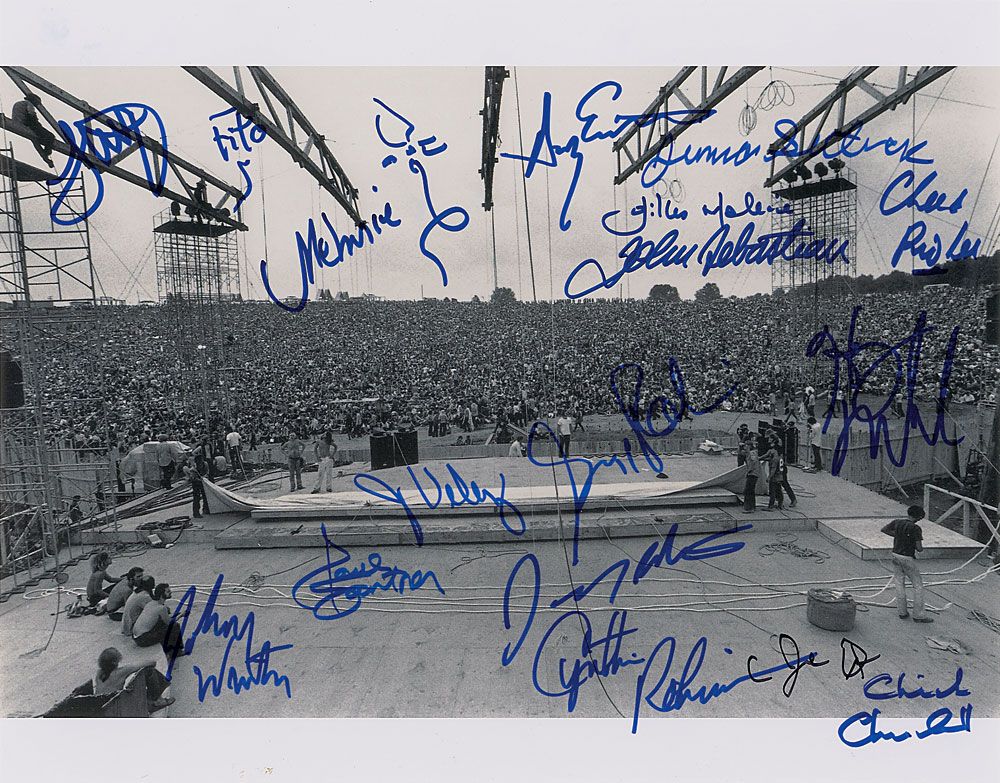 Satin-finish 14 x 11 photo of the crowd at Woodstock taken from the stage, signed in blue and black felt tip by 17 performers: Johnny Winter, John Sebastian, Paul Kantner, Country Joe McDonald, Gregg Rolie, Melanie, Juma Sultan, Jerry Velez, Rick Lee, Chick Churchill, Fito de la Parra, Harvey Mandell, Cynthia Robinson, Jerry Martini, Greg Errico, Steve Katz, and Gilles Malkine. In fine condition.