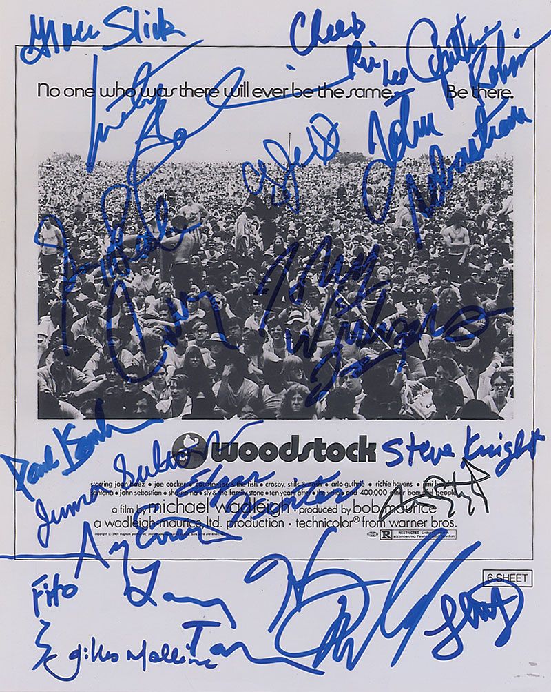 Glossy 8 x 10 photo of a Woodstock movie poster, signed in blue and black felt tip by 22 performers. Signers include: Grace Slick, Paul Kantner, Marty Balin, Tom Constanten, Fito de la Parra, Harvey Mandel, Ric Lee, Jerry Velez, Juma Sultan, John Sebastian, Corky Laing, Steve Knight, Edgar Winter, Jerry Martini, Greg Errico, Cynthia Robinson, Gregg Rolie, and Country Joe McDonald. In fine condition.