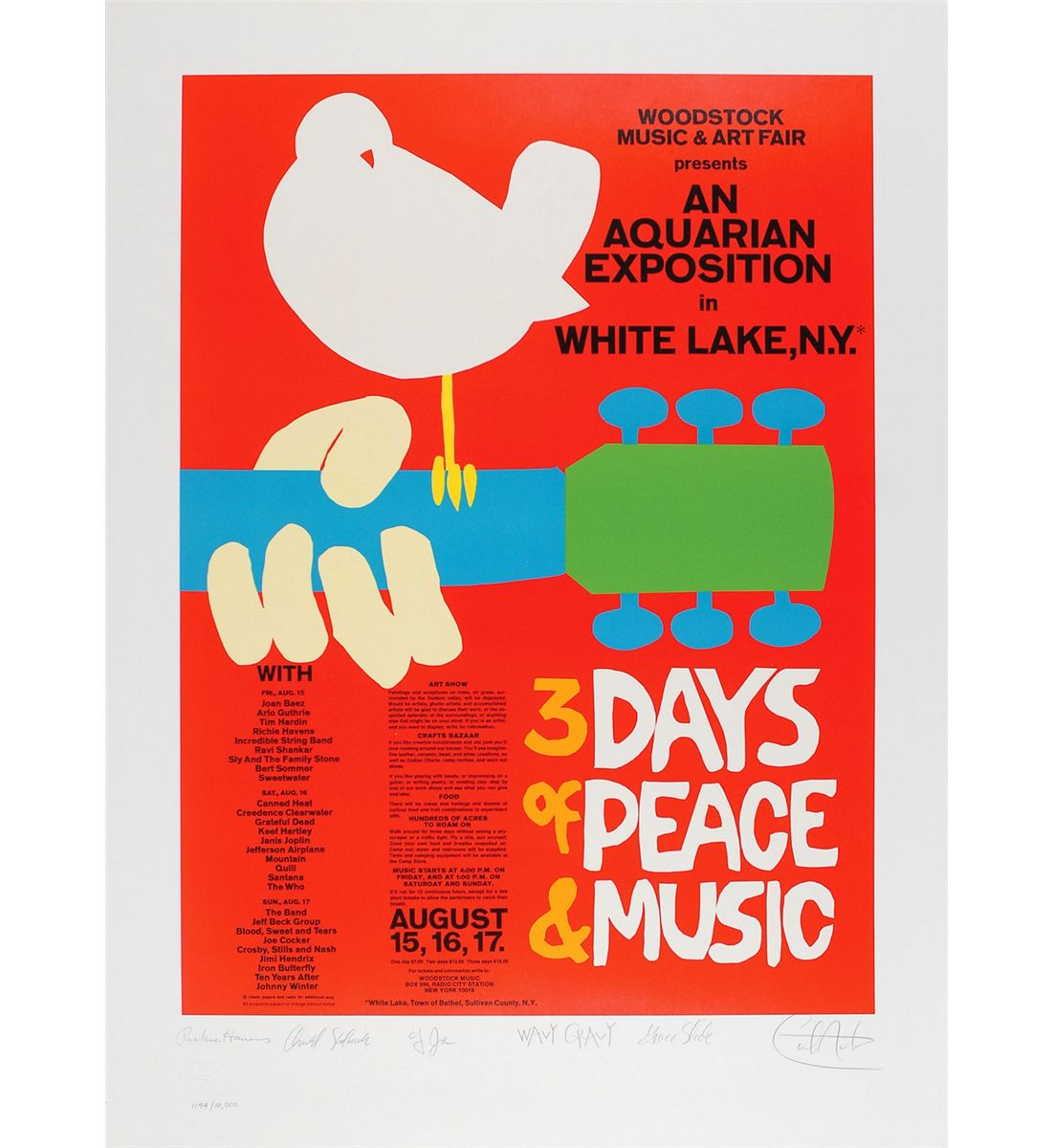 Color limited edition 22 x 30 print of the Woodstock poster, numbered 1194/10000, signed in the lower border in pencil by Richie Havens, Arnold Skolnick, Country Joe, Carlos Santana, Wavy Gravy, and Grace Slick. In very fine condition. Accompanied by an ArtRock COA.
