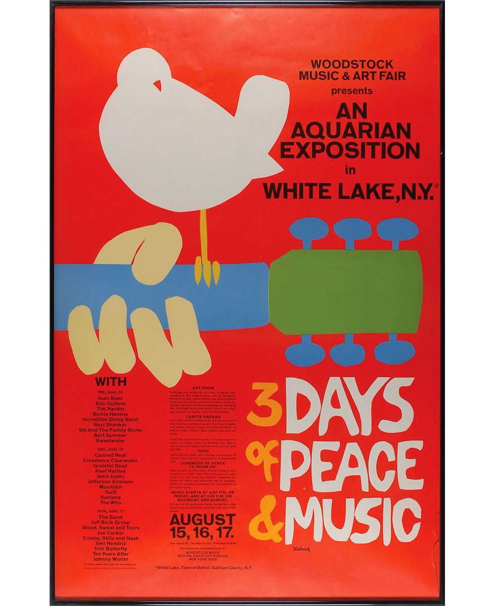 Color limited edition 23.5 x 36 poster of Skolnick’s famous poster for the Woodstock Music Festival, numbered 14/144, signed along the bottom edge in pencil by Skolnick. Framed to an overall size of 24.25 x 37. Scattered small creases and a small crack to glass at lower right corner, otherwise fine condition.