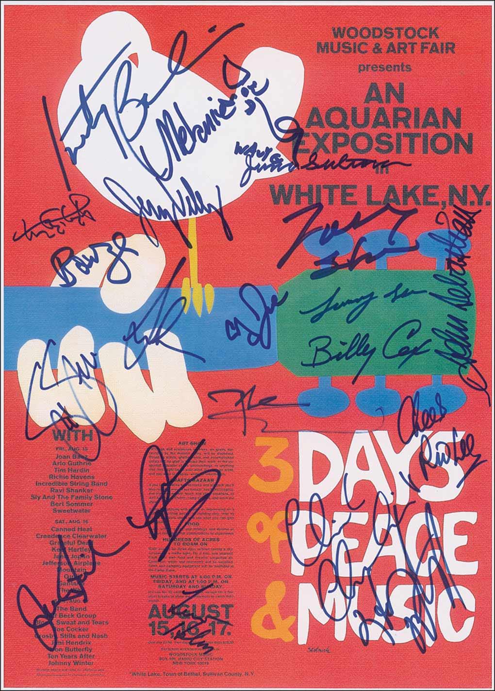 Color 11 x 15 mini-poster for the festival, signed in blue and black felt tip by 21 participants: Melanie, Wavy Gravy, John Sebastian, Country Joe McDonald, Levon Helm, Stephen Stills, Tom Constanten, Jerry Velez, Billy Cox, Larry Lee, Yuma Sultan, Marty Balin, Jorma Kaukonen, Bowzer Bauman, Jim Fielder, Harvey Mandell, Tommy Shannon, Ric Lee, Leo Lyons, Chick Churchill, and Pete Townshend. In very fine condition.