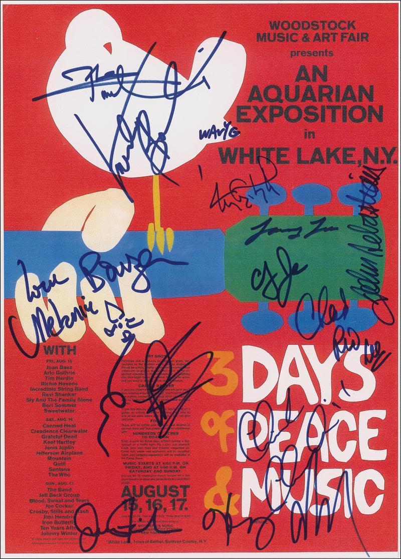 Color 11 x 15 mini-poster for the festival, signed in blue tip by 14 participants including: Melanie, Wavy Gravy, John Sebastian, Country Joe McDonald, Larry Lee, Yuma Sultan, Marty Balin, Jorma Kaukonen, Bowzer Bauman, Ric Lee, Leo Lyons, Chick Churchill, and Pete Townshend. In very fine condition. RRAuction COA.