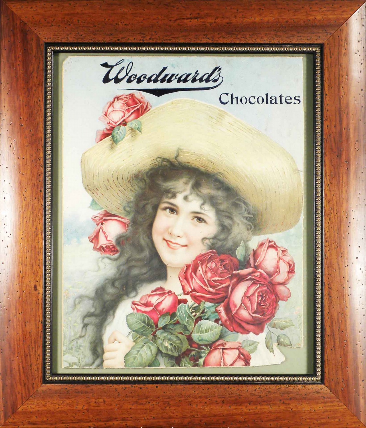 Woodward's Chocolate Cardboard Sign. Framed under glass. Depicts girl wearing a hat holding pink rose. Right side and bottom have been trimmed and paper loss to top left and bottom right. 14 X 18 inches image only.