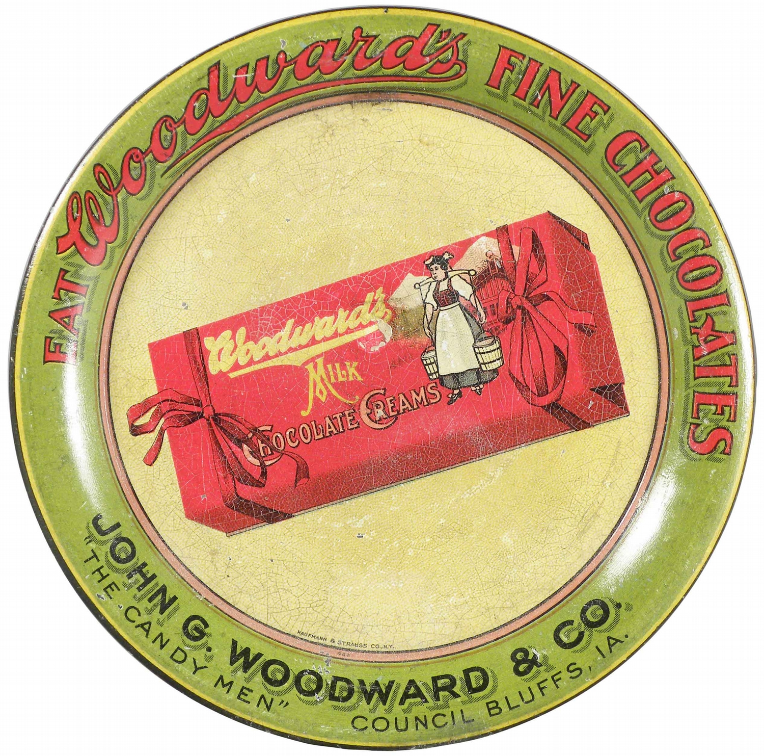 Woodward's Fine Chocolates Tin Tip Tray. Age discoloration and normal crazing in center otherwise very good condition. 4 3/8 inch diameter.