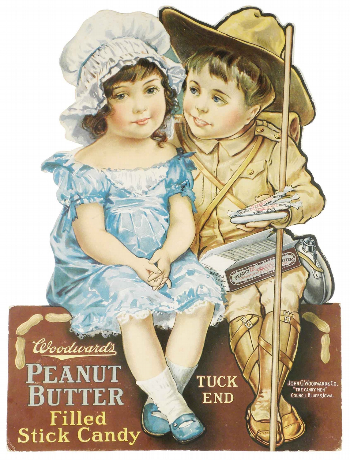 Woodward's Peanut Butter Filled Stick Candy Die Cut Cardboard Sign. Depicting a little boy and little girl. John G. Woodward & Co. Council Bluffs, IA. Framed under glass. Excellent condition. 10 X 14 inches image only.